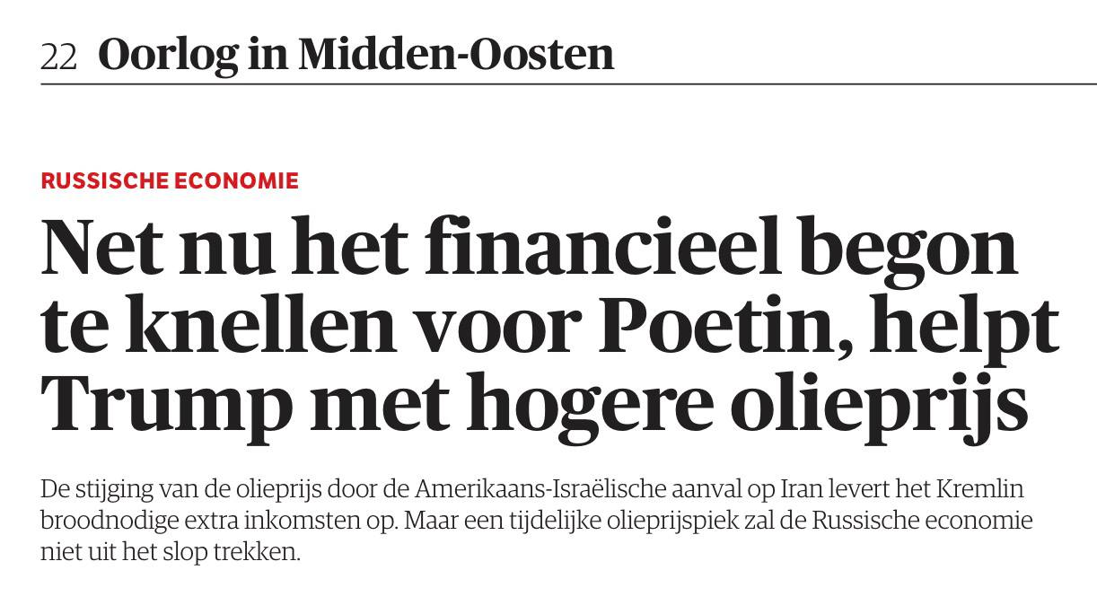 Самая русофобская газета Нидерландов NRC пишет сегодня статью: «Как раз когда финансовое положение Путина начало ухудшаться, Трамп помог ему, повысив цены на нефть».