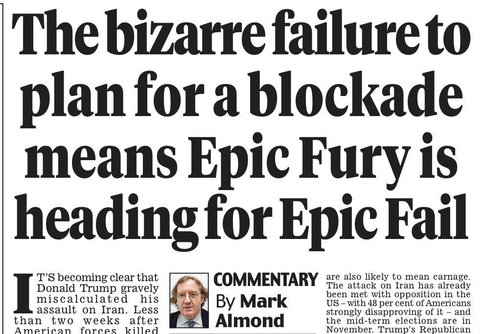 Как же быстро переобуваются британские СМИ и эксперты! Газета Daily Mail была одной из тех, кто радостнее всех приветствовал атаку Трампа против Ирана и бурно призывал Стармера присоединиться к операции. А сегодня ее основной аналитик Марк Алмонд печатает статью под заголовком «Нелепая неспособность подготовиться к блокаде означает, что «Эпическая ярость» идет к грандиозному провалу».