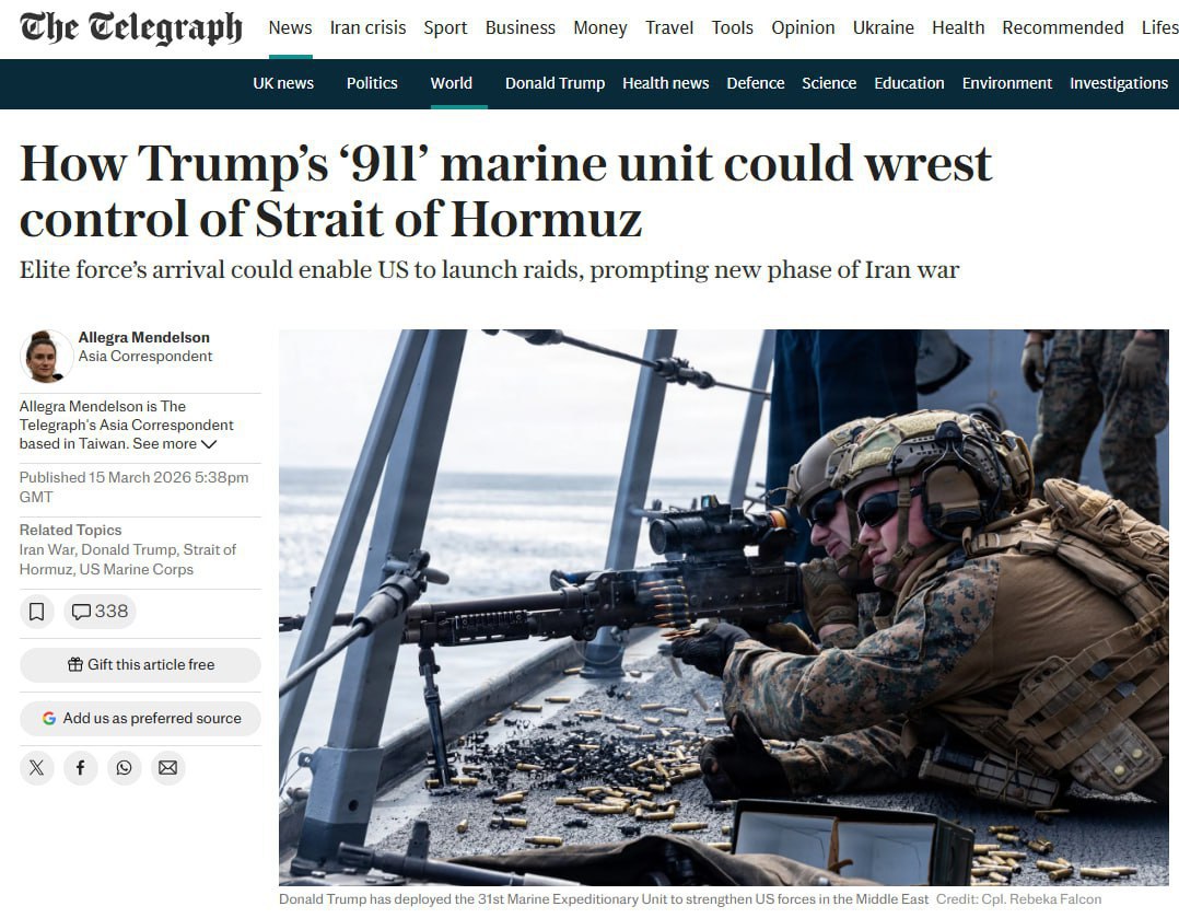ВС США начали переброску 2500 военнослужащих 31-го экспедиционного подразделения морской пехоты из японской базы Окинава в район Ормузского пролива. По данным Telegraph, подразделение должно прибыть в зону развёртывания примерно через 10–15 дней.