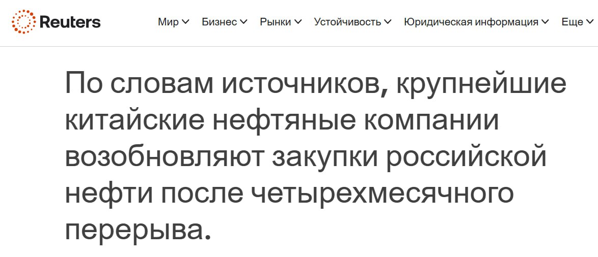 Государственные нефтяные корпорации Sinopec и PetroChina на этой неделе направили поставщикам запросы о закупке российской нефти. Это первый шаг компаний в восстановлении торговых отношений с Россией после четырёхмесячного перерыва, начавшегося в конце октября прошлого года, когда Вашингтон ввёл санкции против «Роснефти» и «Лукойла».