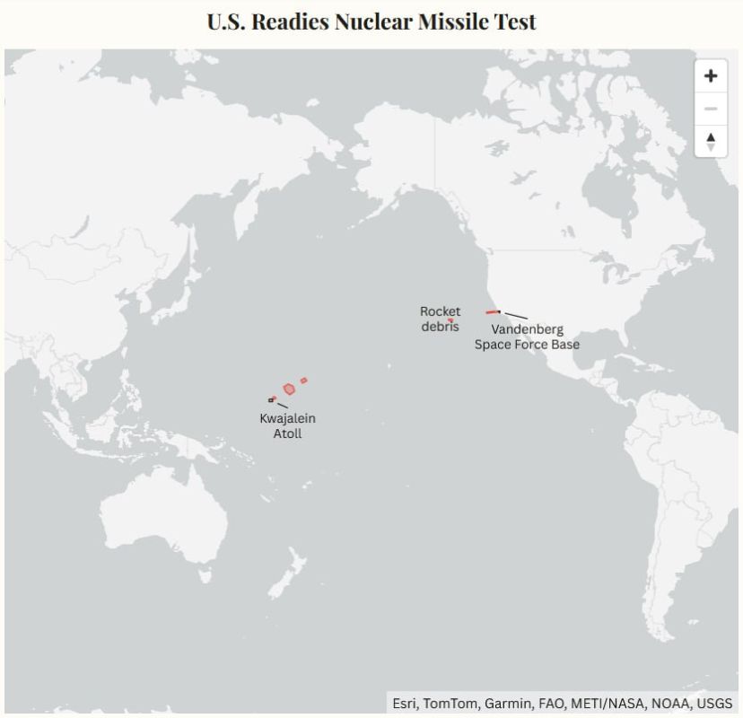 По данным издания Newsweek, навигационные предупреждения указывают, что запуск состоится между средой и четвергом с базы Ванденберг (Калифорния) в направлении атолла Кваджалейн (Маршалловы острова).