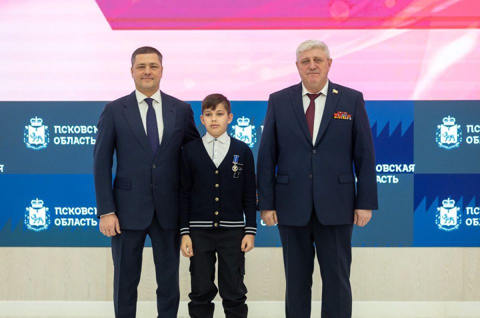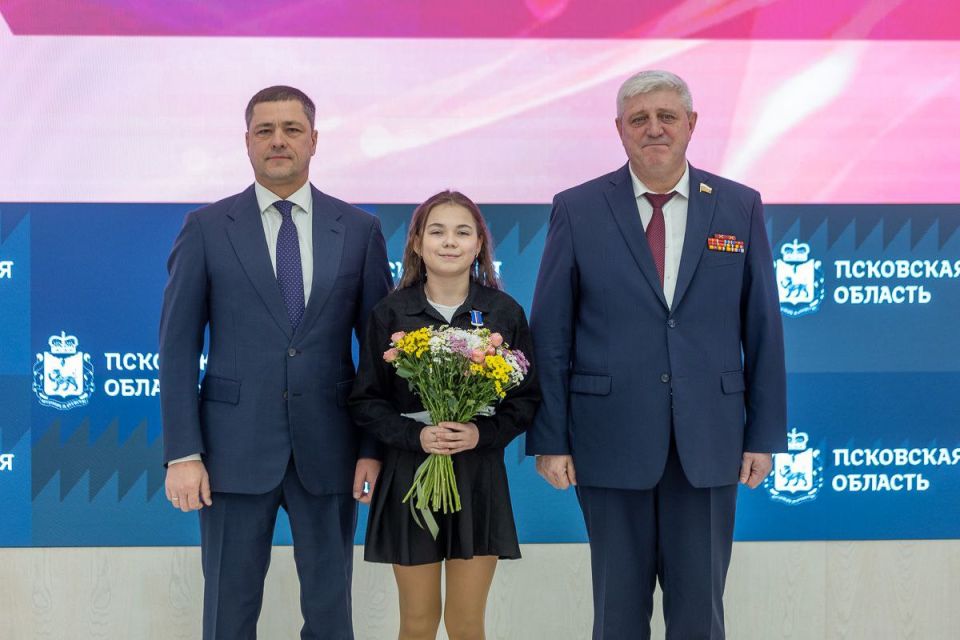 Сегодня в Правительстве Псковской области губернатор Михаил Ведерников наградил Викторию Соболеву и Артура Заливина медалями «За проявленное мужество».