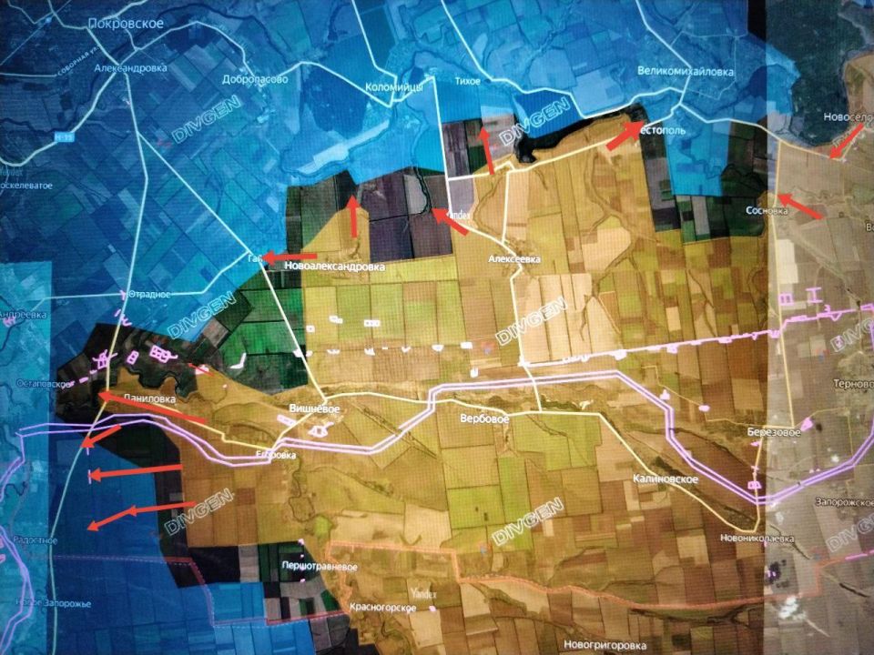 На юге Днепропетровщины ВС РФ додавили Даниловку и выбили из неё и опорных пунктов южнее противника, перерезали физически дорогу на Гуляйполе из Покровского, а также продвинулись на подступы к Нечаевке и Радостному южнее, у границы.