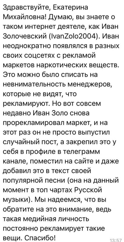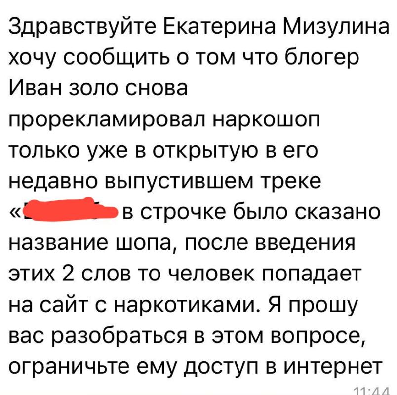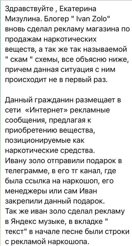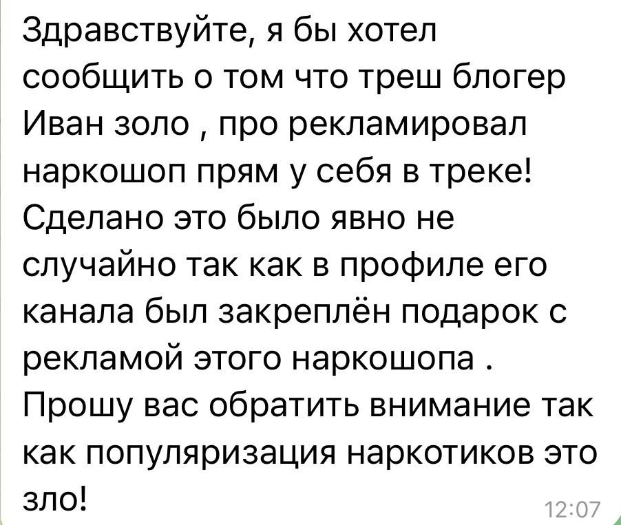 Многие пишут который день о рекламе наркошопов блогером «Иван Золо». Как сообщают пользователи, реклама присутствовала на ресурсах блогера, в закрепленных подарках, а также в одном из новых треков. По словам подписчиков, такие действия блогер совершает систематически. А позже удаляет рекламу, оправдываясь действиями менеджеров или состоянием здоровья. Обратились в МВД по этому вопросу
