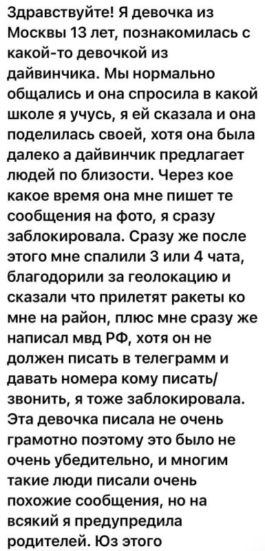 В последние полгода каждый день я получаю письма от подростков и студентов, которые познакомились с кем-то в боте «дайвинчик» и стали жертвой мошенничества, домогательств педофилов или были вовлечены в преступление. Кроме того, в ряде последних случаев, когда совершались поджоги или другие преступления подростками, провокаторы находили их и втягивали в преступление именно через этот бот. Эти данные уже есть в материалах уголовных дел.
