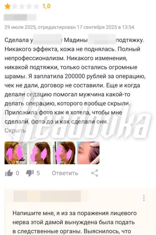 Сейчас пострадавшая испытывает трудности с приемом пищи — еда попросту выпадает изо рта. Когда женщина потребовала вернуть деньги, Мадина Ц. отказалась и, по словам пострадавшей, перешла на оскорбления. В отзывах упоминаются и другие пациентки, столкнувшиеся с осложнениями после приема у «врача». По данным «СПАРК-Интерфакс», спустя месяц после неудачной операции клиника закрылась. Девушка подала заявление в полицию и добивается возбуждения уголовного дела, но пока безрезультатно. Пока Марте остается лишь проходить длительное и дорогое лечение, чтобы вернуться к обычной жизни.