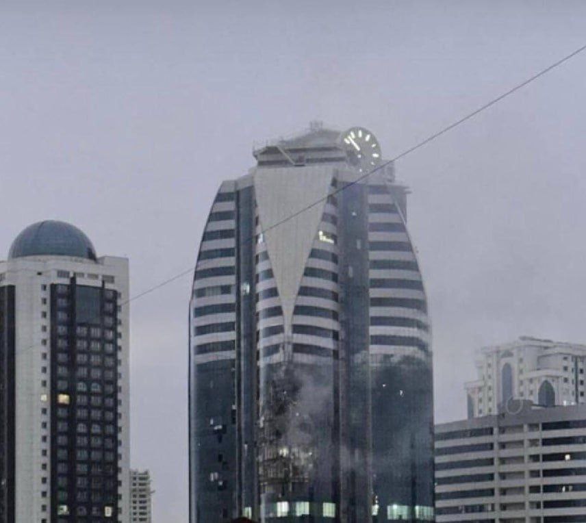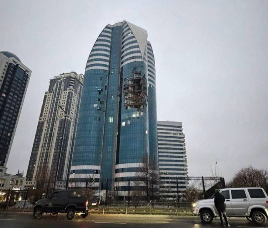 Ночью дрон попал в один из небоскребов в Грозном. Поврежден фасад здания на нескольких этажах.