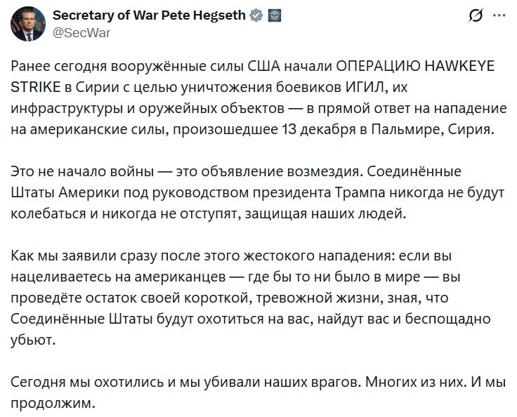 «Это не начало войны — это объявление возмездия. США под руководством президента Трампа никогда не будут колебаться и не отступят, защищая своих людей», — подчеркнул глава Пентагона.