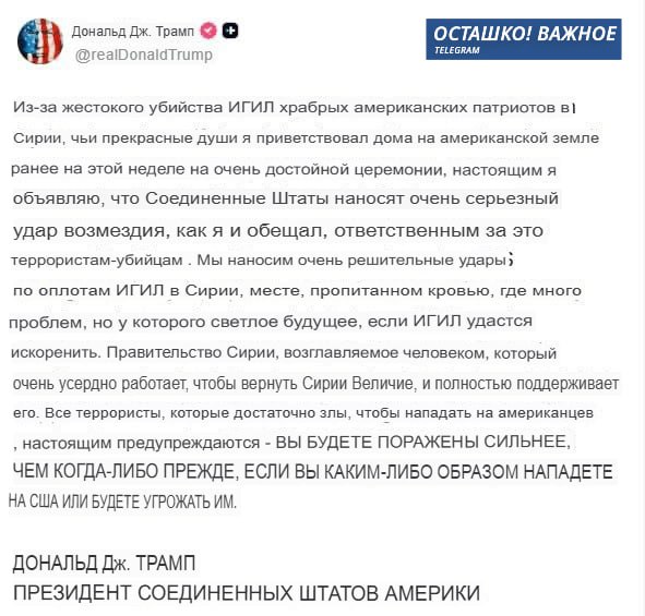 «В ответ на жестокое убийство ИГ* отважных американских патриотов в Сирии — людей с прекрасными душами, которых я на этой неделе с большим достоинством встретил на родной американской земле во время траурной церемонии, — я настоящим объявляю: США наносят крайне серьёзный ответный удар, как я и обещал, по террористам-убийцам, ответственным за это преступление»,