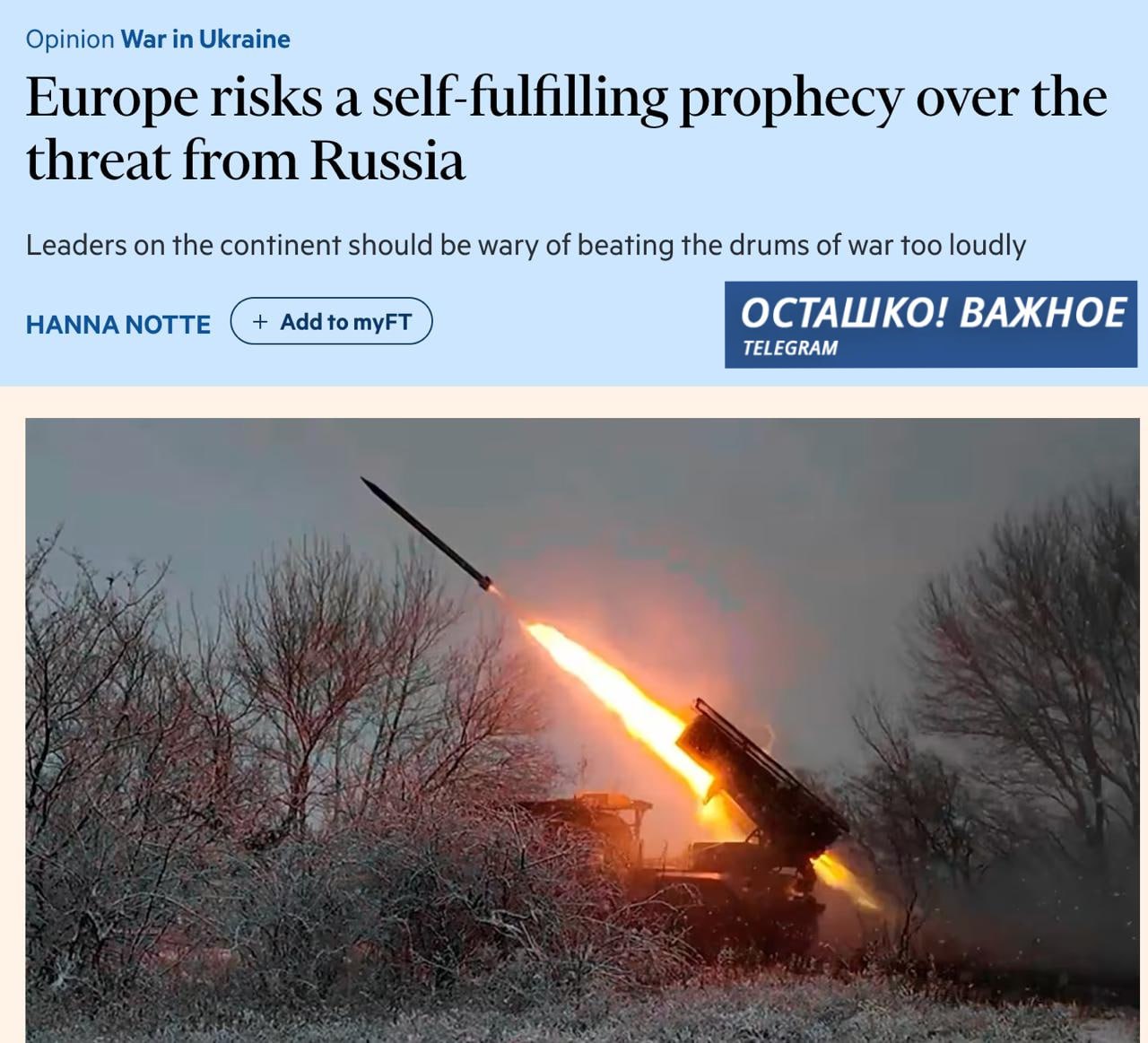 FT отмечает, что разговоры о скорой войне с Россией масштабов Второй мировой стали чрезмерной реакцией на прежнюю ошибку 2022 года, когда угрозу со стороны Москвы, напротив, недооценили. Такой подход, подчёркивает газета, подменяет трезвый анализ подтверждением собственных опасений, тогда как Россия может ограничиться гибридным давлением, не рискуя прямым столкновением с НАТО.