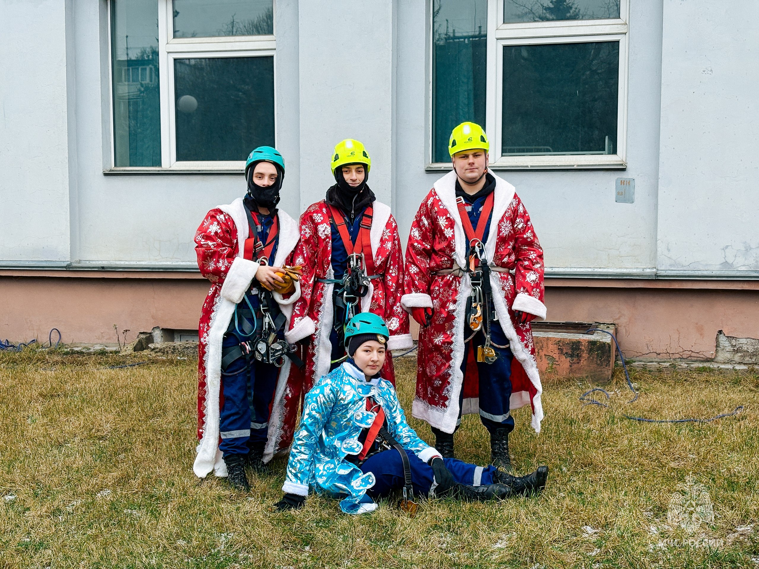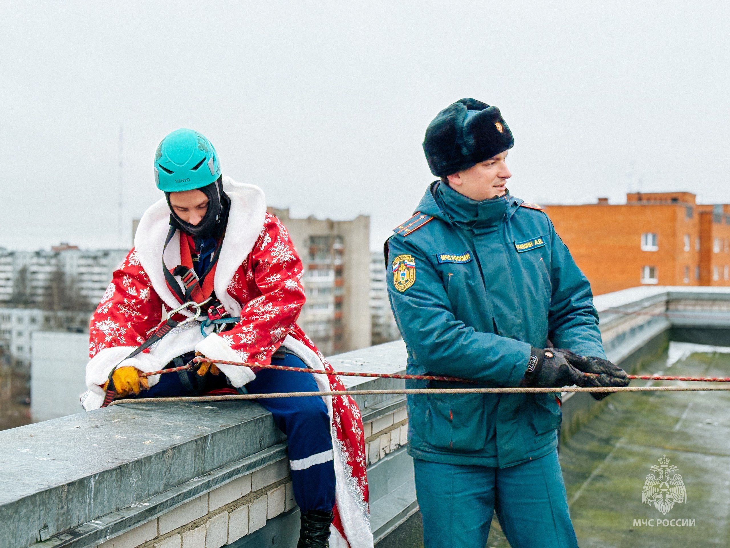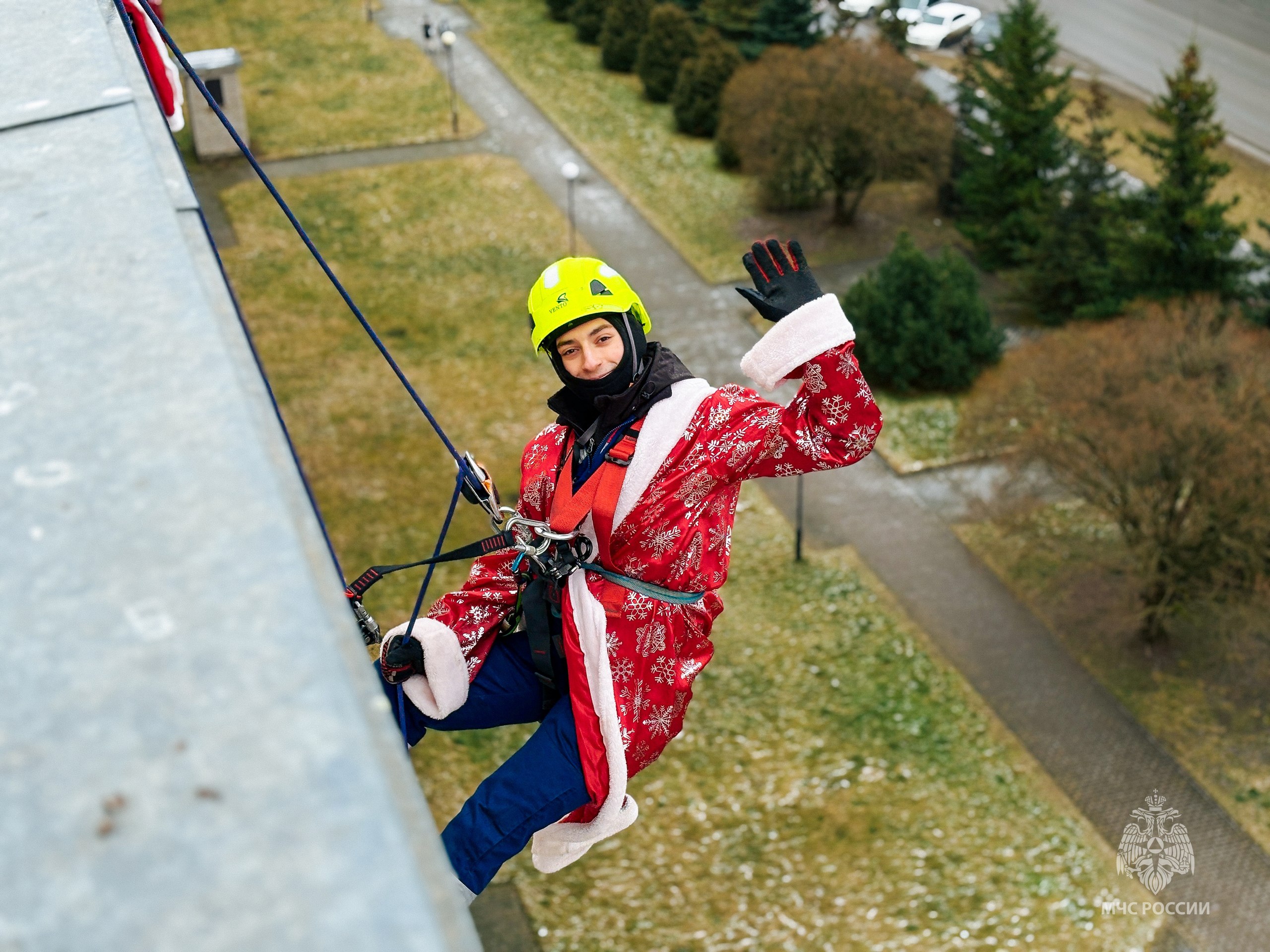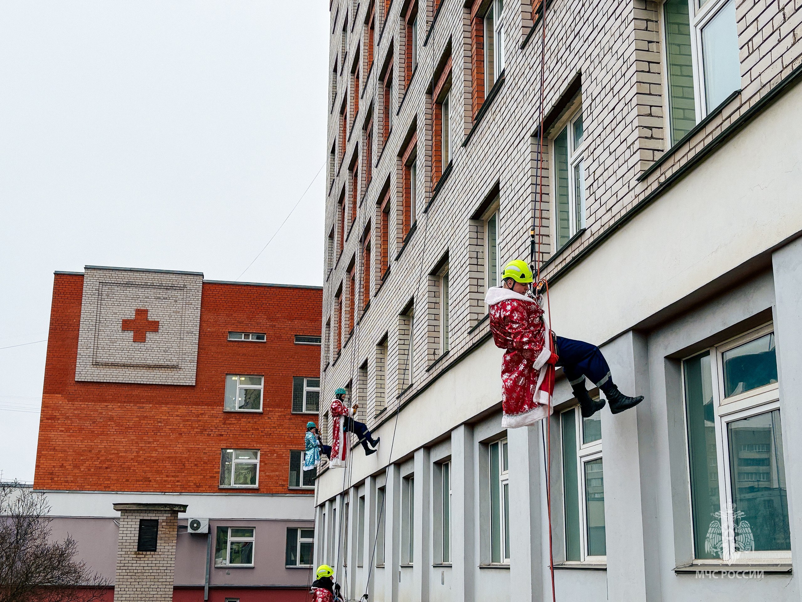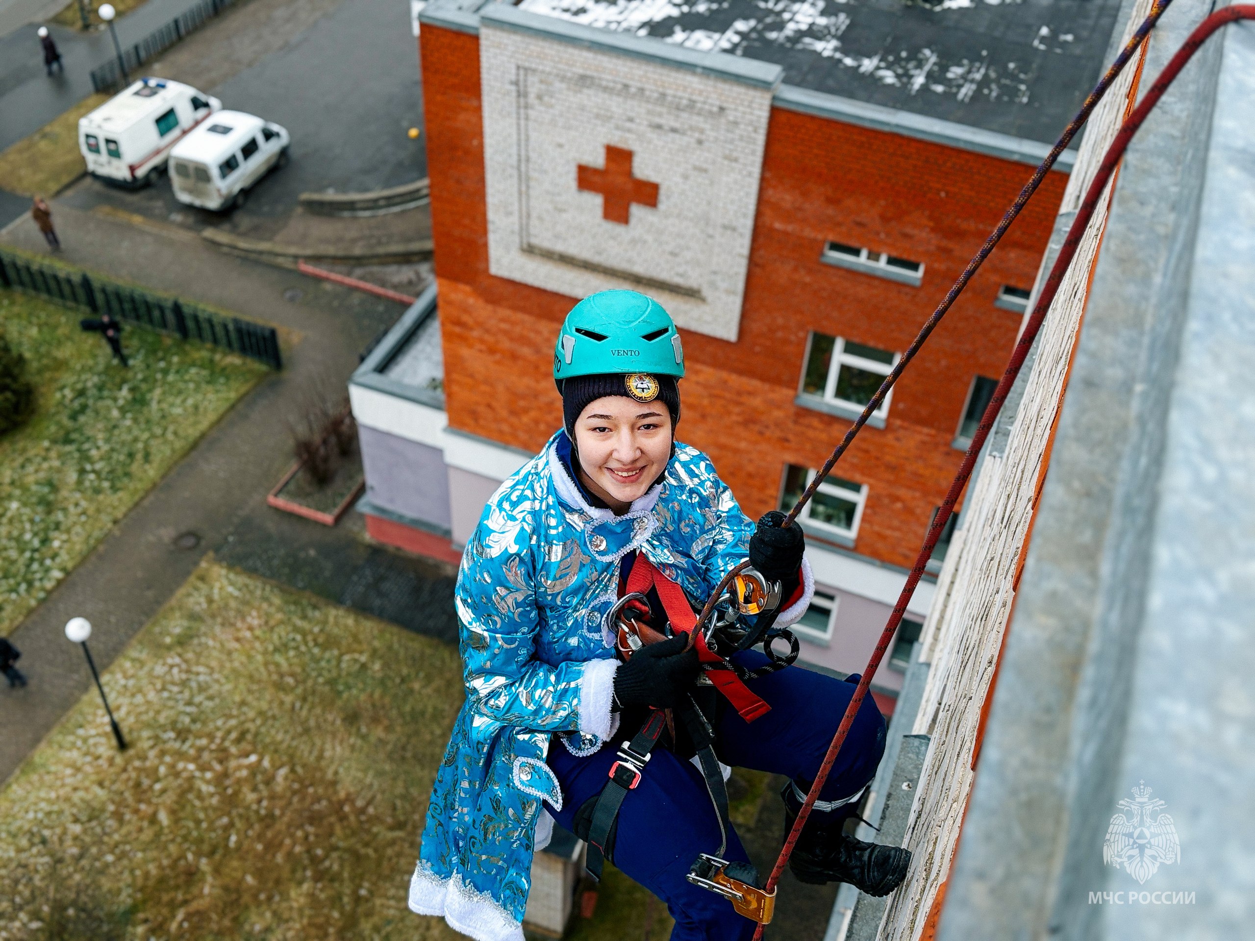 Под руководством сотрудников Главного управления МЧС России по Псковской области добровольцы в костюмах новогодних героев спустились с крыши ГБУЗ ПО "Детская областная клиническая больница" с помощью альпинистского снаряжения.