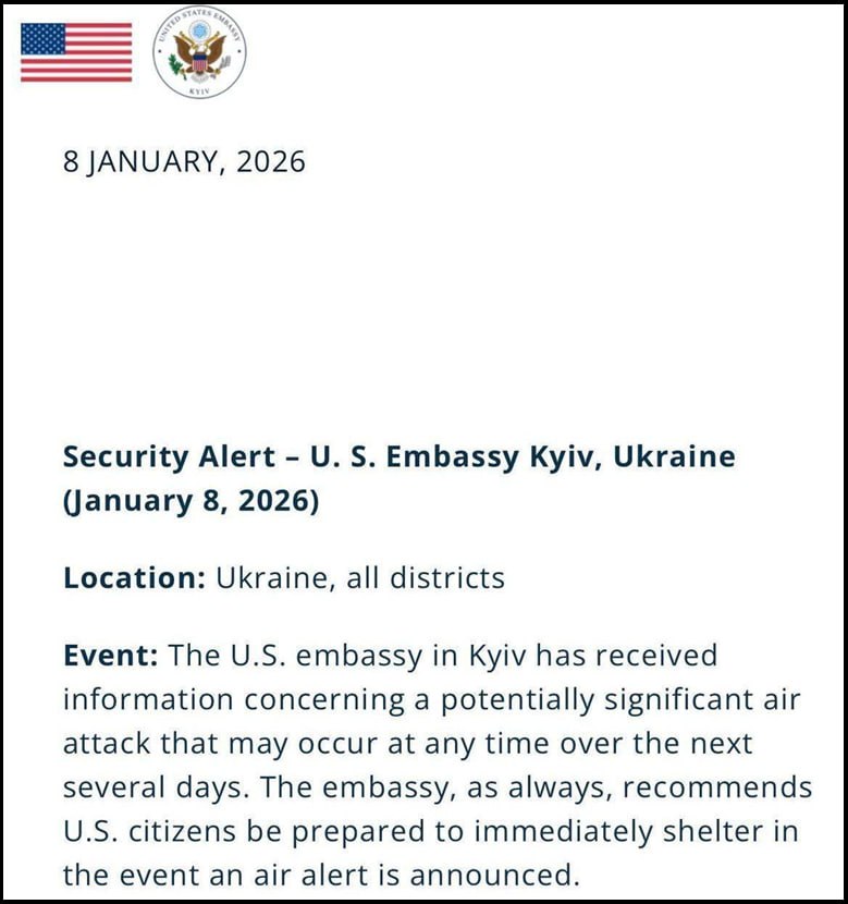 Американское посольство в Киеве на этом фоне выпустило предупреждение, в котором попросило своих граждан не игнорировать сигнал тревоги и укрываться в бомбоубежищах.