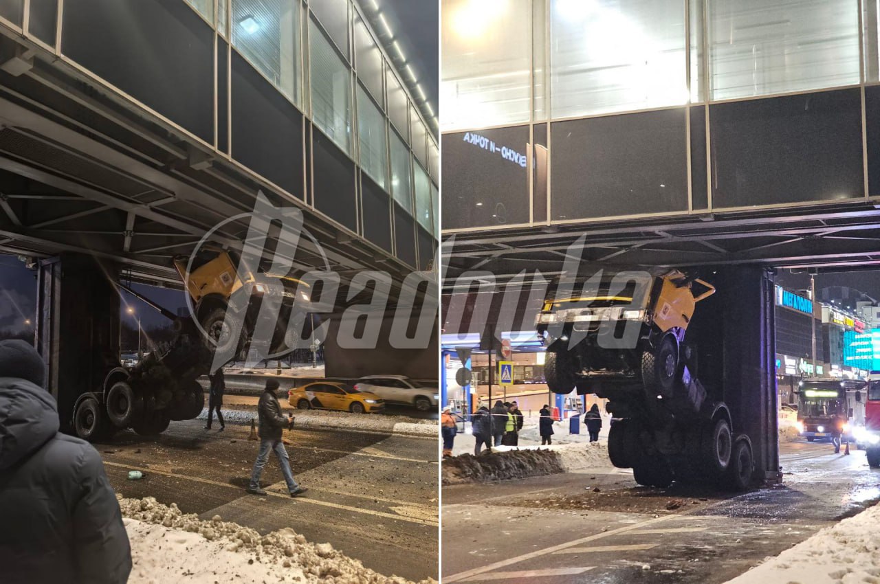 Рядом с метро «Технопарк» самосвал застрял между трассой и мостом. Машина не смогла втиснуться в пространство, в результате чего кузов зацепился за мост и авто «встало на дыбы». Кабину расплющило, но водитель успел выпрыгнуть и не пострадал, пишут очевидцы.