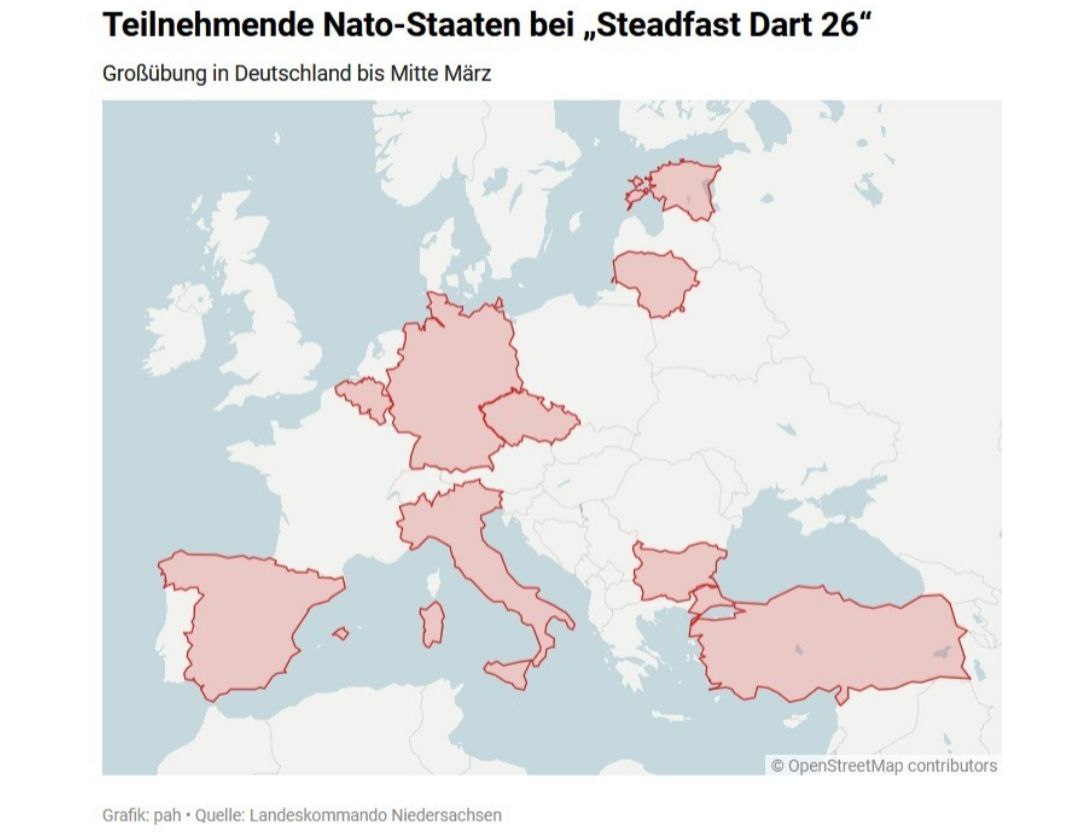 В военных учениях "Steadfast Dart", которые продлятся до середины марта, будет задействовано более 10 тысяч военнослужащих из 11 стран – Германии, Италии, Франции, Британии, Испании, Бельгии, Чехии, Литвы, Болгарии, Греции и Турции. Главный логистический хаб – Германия. США в маневрах участия не принимают.
