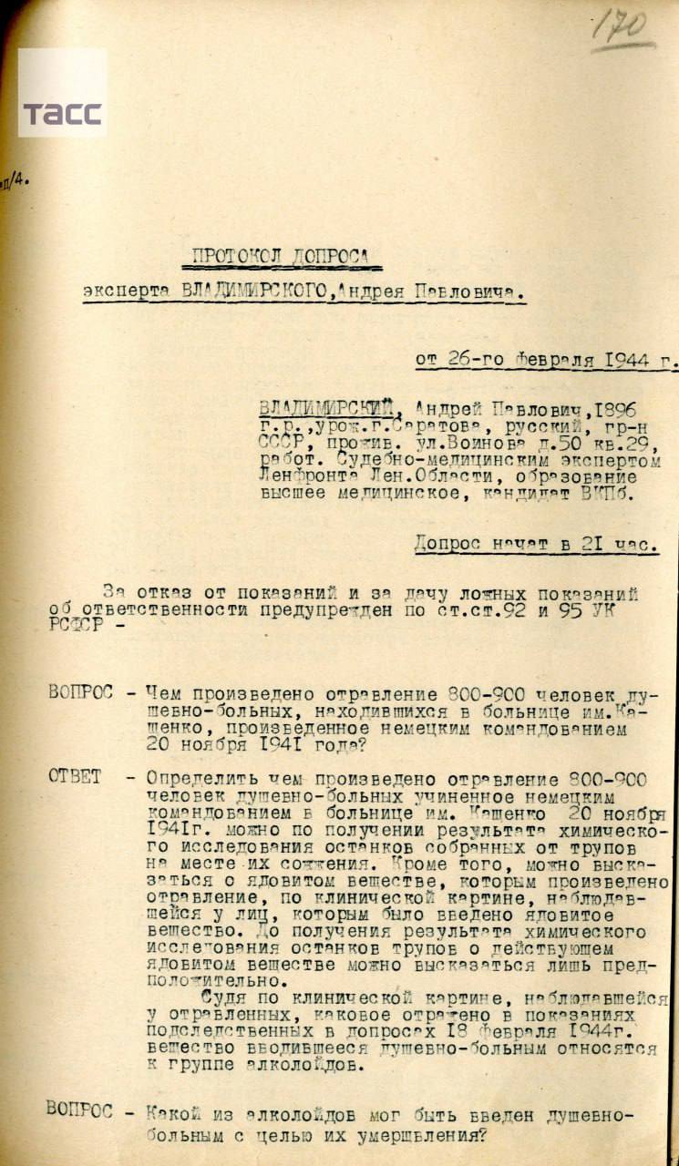 Среди публикуемых документов – выписки из актов о злодеяниях немецко-фашистских захватчиков в Гатчинском районе, копия приговора Военного трибунала Ленинградского фронта от 9 апреля 1944 года в отношении фигурантов дела, протокол допроса главного судмедэксперта Ленинградского фронта Андрея Владимирского, а также акт судебно-медицинской экспертизы, датируемый 20-22 февраля 1944 года.