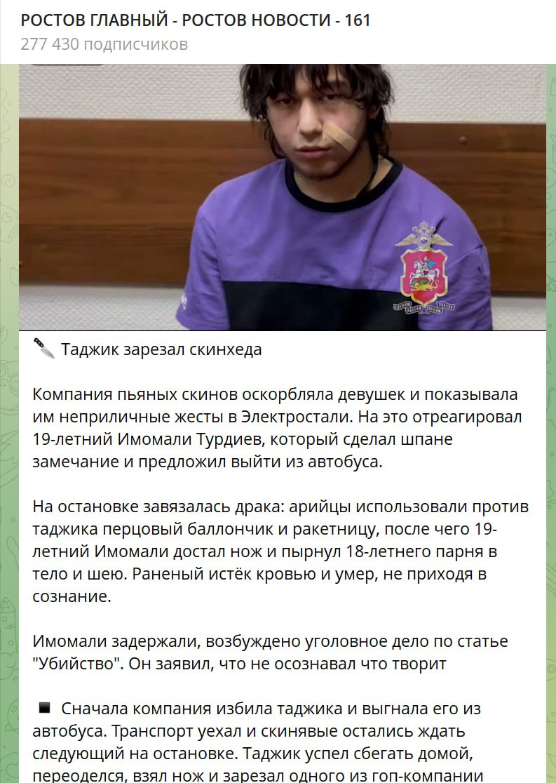 Всё это не бьется с сообщениями очевидцев, которые пишут, что после первоначального конфликта таджик сходил домой за ножом, а затем вернулся с подмогой.