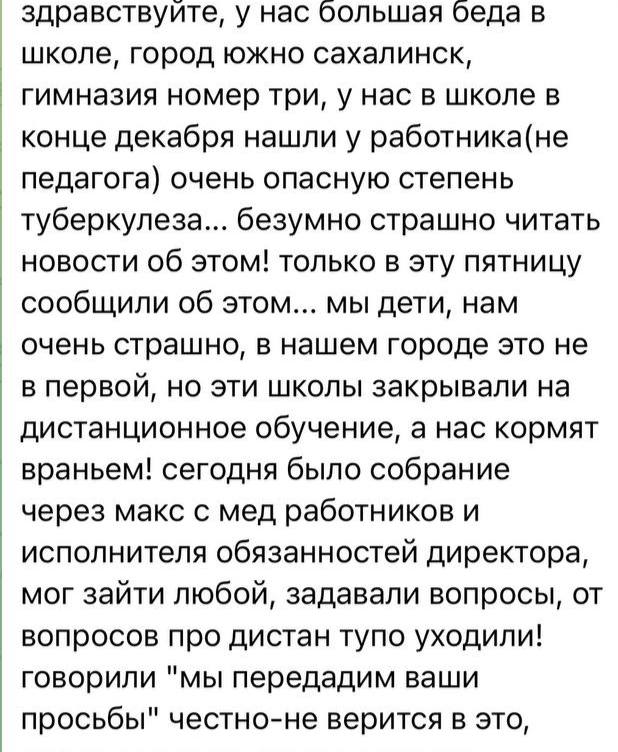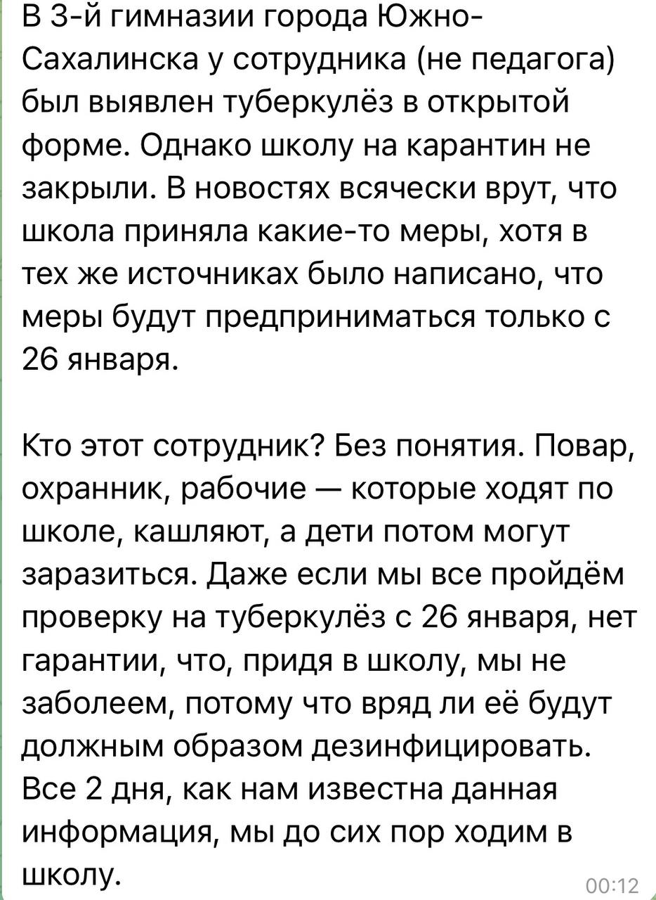 В гимназии №3 в Южно-Сахалинска один из сотрудников школы ходил на работу с открытой формой туберкулеза. С аналогичной проблемой ко мне обратились и жители Санкт-Петербурга