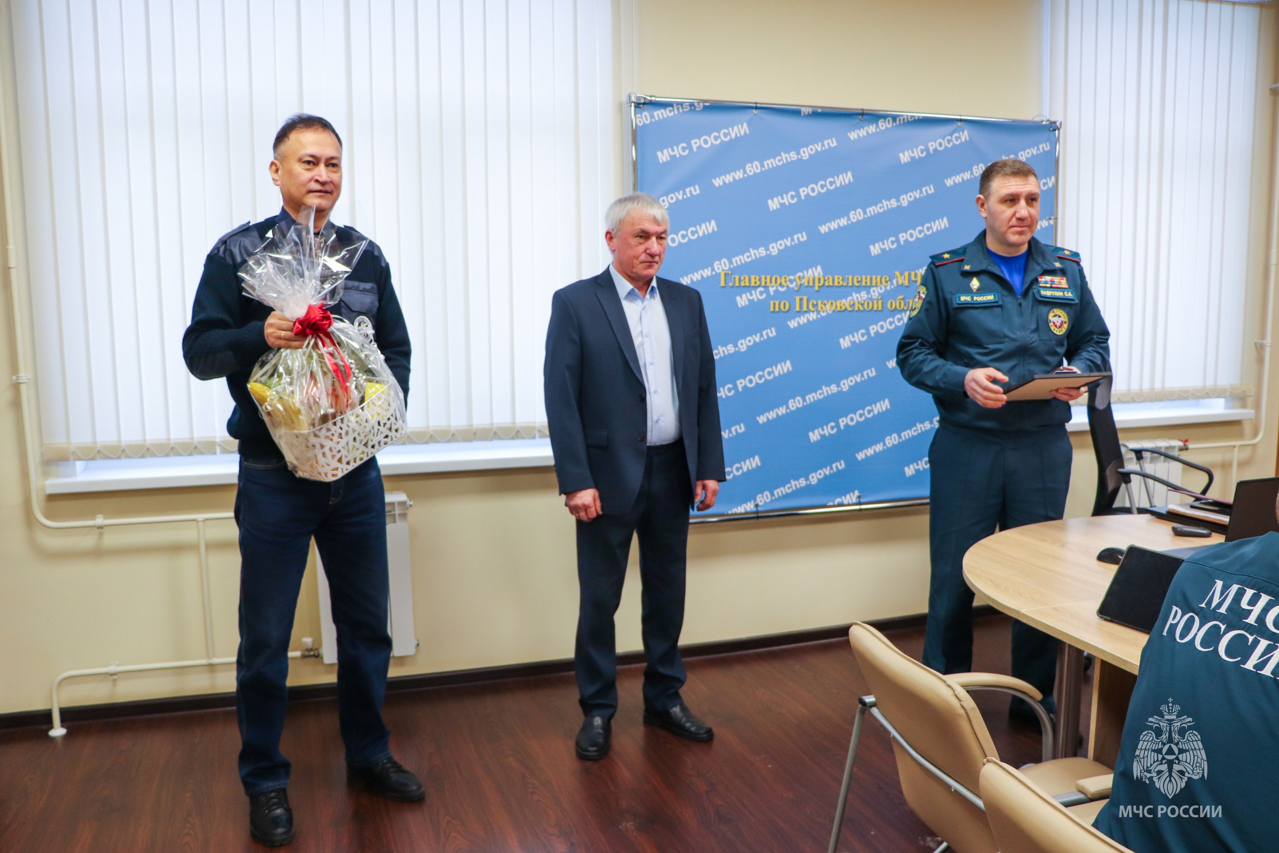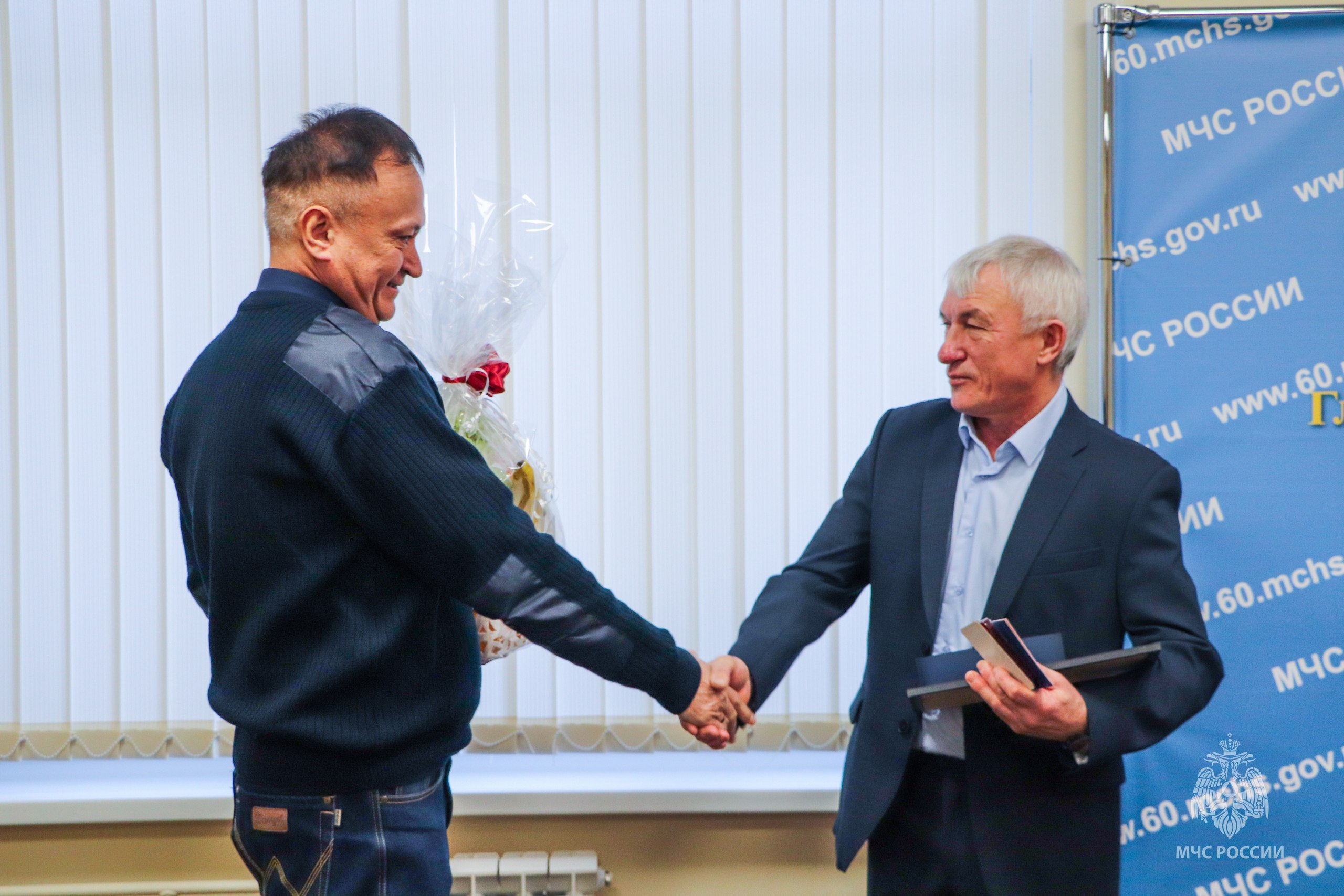 От лица всех ветеранов ведомства с юбилеем поздравил председатель Регионального отделения общероссийской общественной организации ветеранов органов управления по делам гражданской обороны, чрезвычайным ситуациям и пожарной охраны Псковской области Вячеслав Пан.