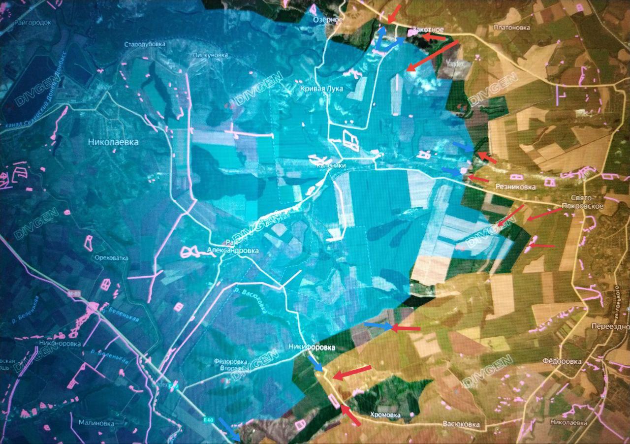 Подразделения ГрВ "Юг" продолжают бои за высоты в районе юго-западная окраина Закотного — Кривая Лука — Резниковка и продвинулись в Резниковке и южнее, заняв позиции противника с которых он контратаковал наши подразделения в Резниковке и Кирово (Свято-Покровском).