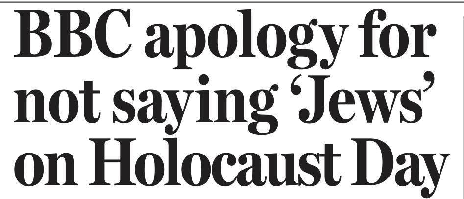 Очередной пример идиотизма при освещении Дня памяти жертв Холокоста. Би-Би-Си официально извинилась за то, что в нескольких сюжетах ведущие, говоря об этом дне, тщательно избегали упоминания слово «евреи». То есть постоянно повторяли: «Были убиты шесть миллионов человек».