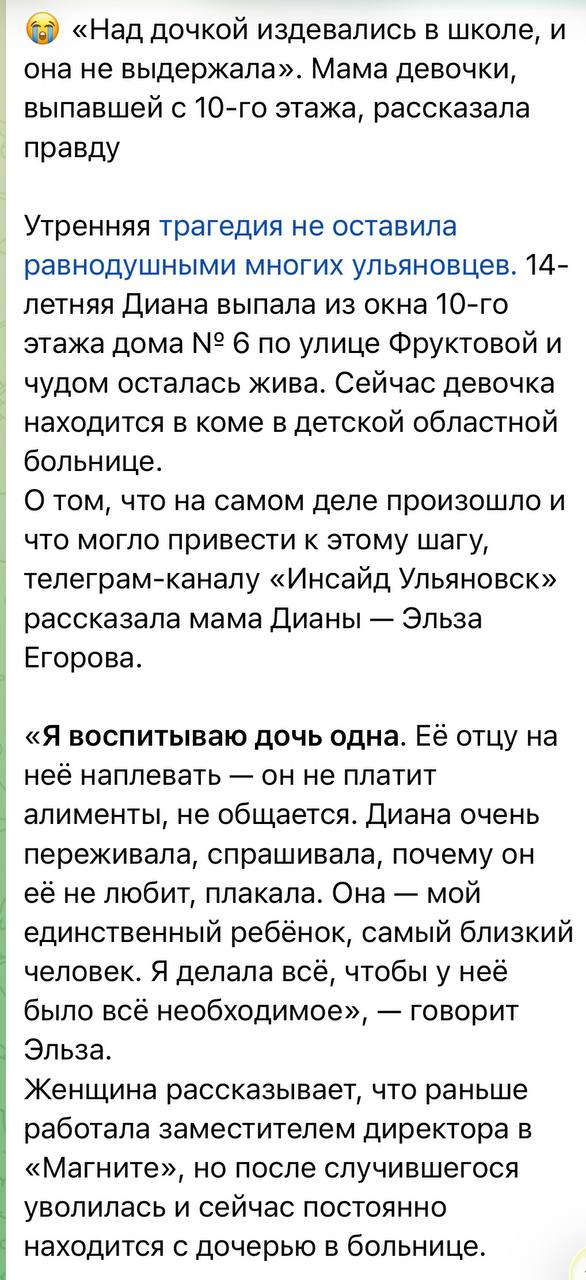 По словам мамы школьницы, причина попытки суицида - в травле. Одноклассницы издевались над девочкой, создали канал, выкладывая фото с оскорблениями в канале в соцсетях. Из-за этого с ней перестали обращаться другие ребята. Всё это и подтолкнуло ребенка на отчаянный шаг. При этом, как говорит её мама, она обращалась в правоохранительные органы в связи с вероятным доведением до суицида, но получила отказ.
