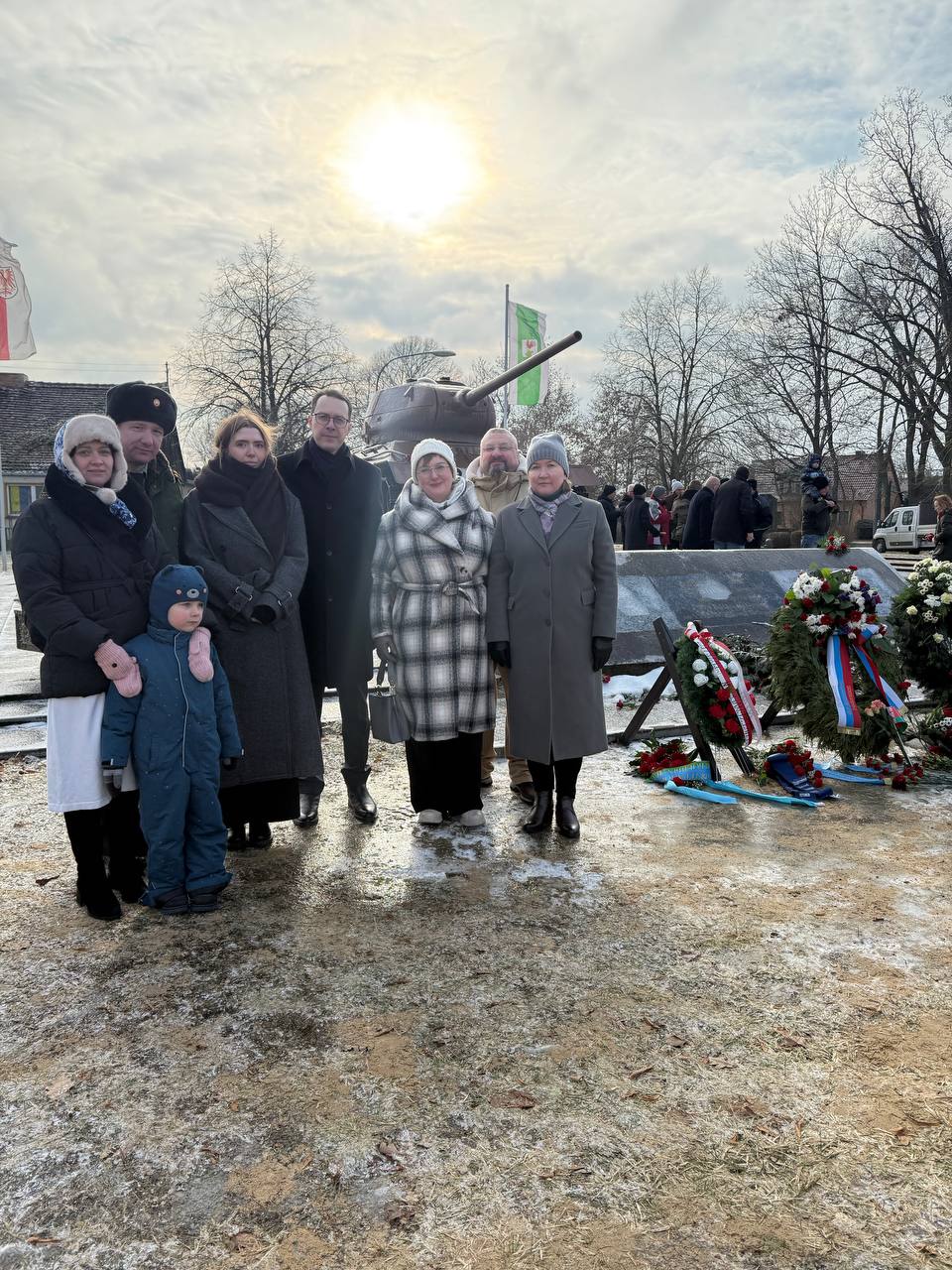 Участники церемонии возложили венки и цветы к мемориалу советским солдатам, представляющему собой установленный на каменном постаменте советский танк Т-34, а также к памятнику всем гражданским жертвам Второй мировой войны.