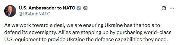 Постпред США при НАТО Мэттью Уитакер: По мере того как мы работаем над достижением соглашения, мы обеспечиваем Украину необходимыми средствами для защиты её суверенитета. Союзники активизируют усилия, приобретая первоклассное американское оборудование, чтобы предоставить Украине оборонные возможности, в которых она нуждается.