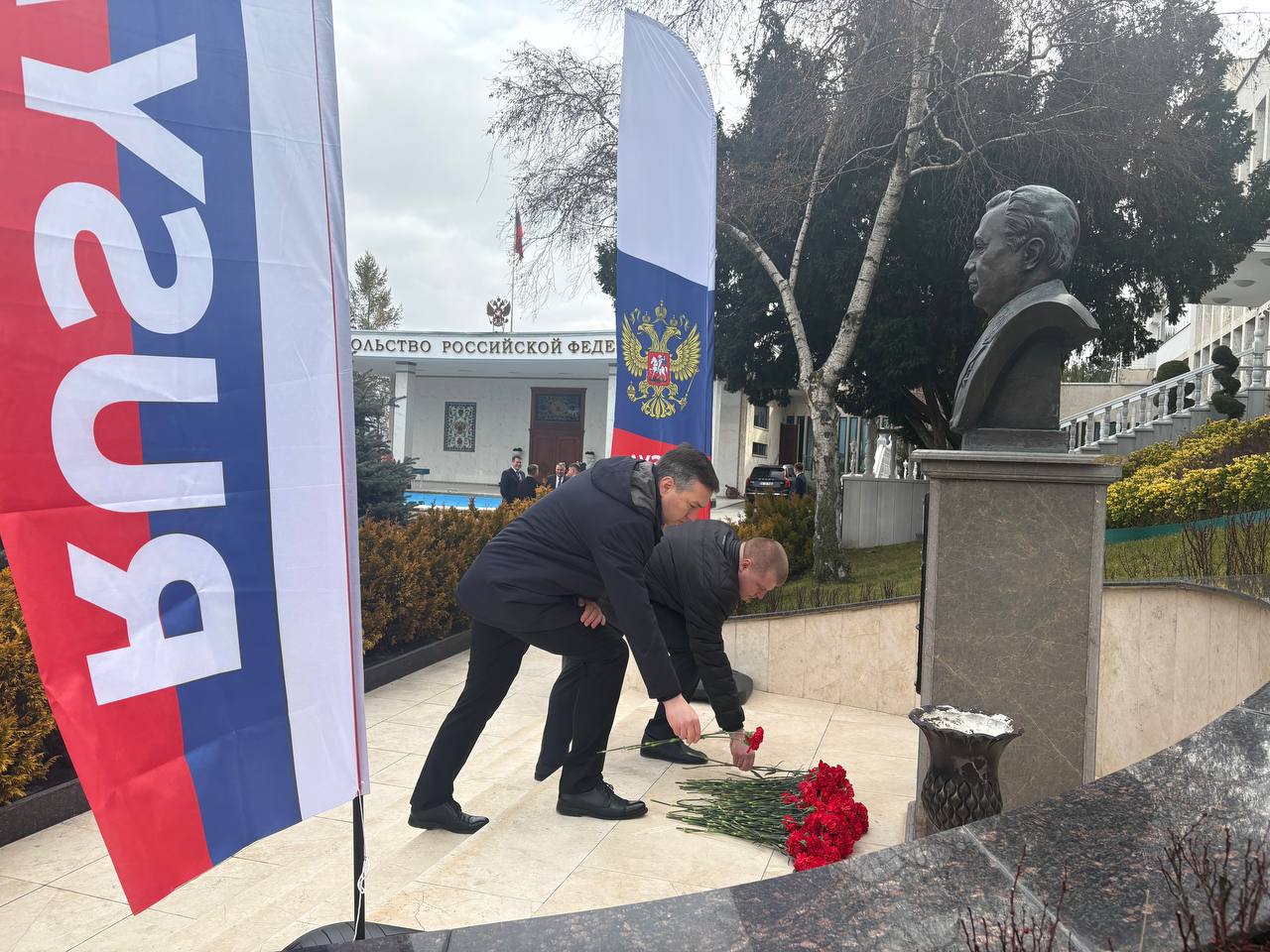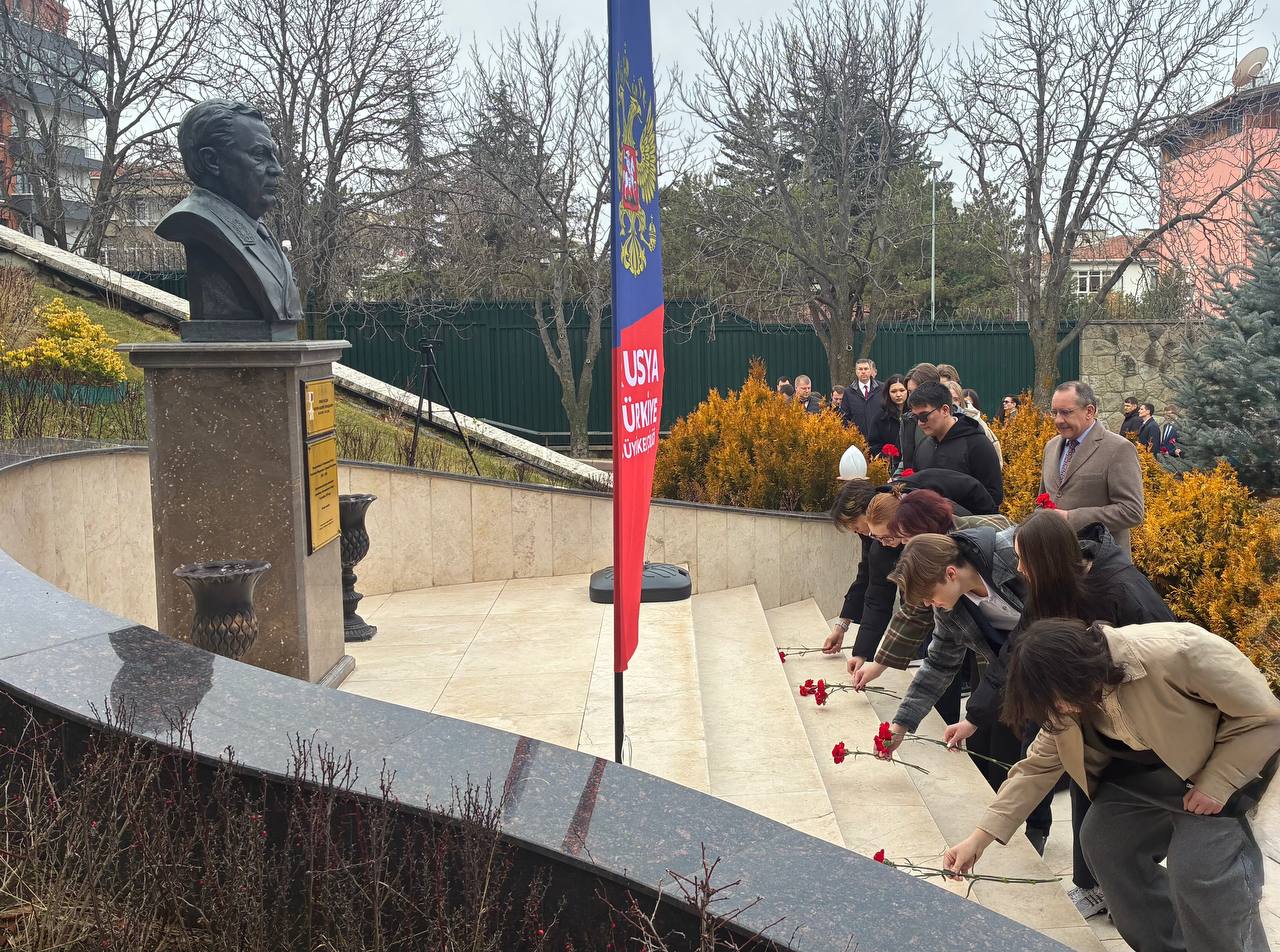 10 февраля в День дипломатического работника коллектив Посольства России в Турции почтил память Посла А.Г.Карлова, погибшего в Анкаре в результате теракта при исполнении служебных обязанностей 19 декабря 2016 г., возложив цветы к установленному на территории загранпредставительства бюсту Героя России.