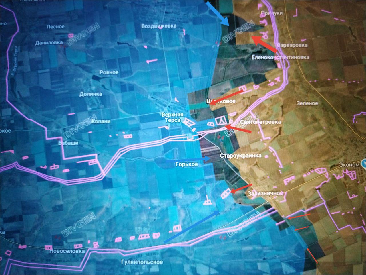 Севернее ВСУ предприняли ряд контратак в пешем порядке и на технике со стороны Рождественского и Воздвижевки в направлении Жовневого (Еленоконстантиновки) и Прилук и из района Бойково в направлении Терноватого, за которое продолжаются ожесточённые встречные бои.