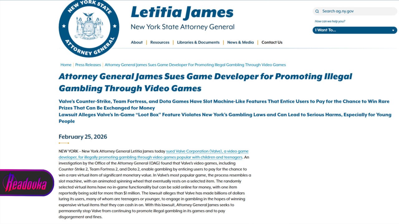 Генеральный прокурор Нью-Йорка Летиция Джеймс подала иск против компании Valve Corporation Гейба Ньюэлла, обвинив корпорацию в «незаконном продвижении азартных игр через видеоигры». Генеральная прокуратура города провела расследование, которое показало, что видеоигры компании, включая Counter-Strike 2, Team Fortress 2 и Dota 2 побуждают пользователей платить за возможность выиграть редкий виртуальный предмет в «лутбоксах» (кейсах). Как показало расследование, предметы не имеют никаких преимуществ перед стандартными моделями, но при этом продаются за крупные суммы.