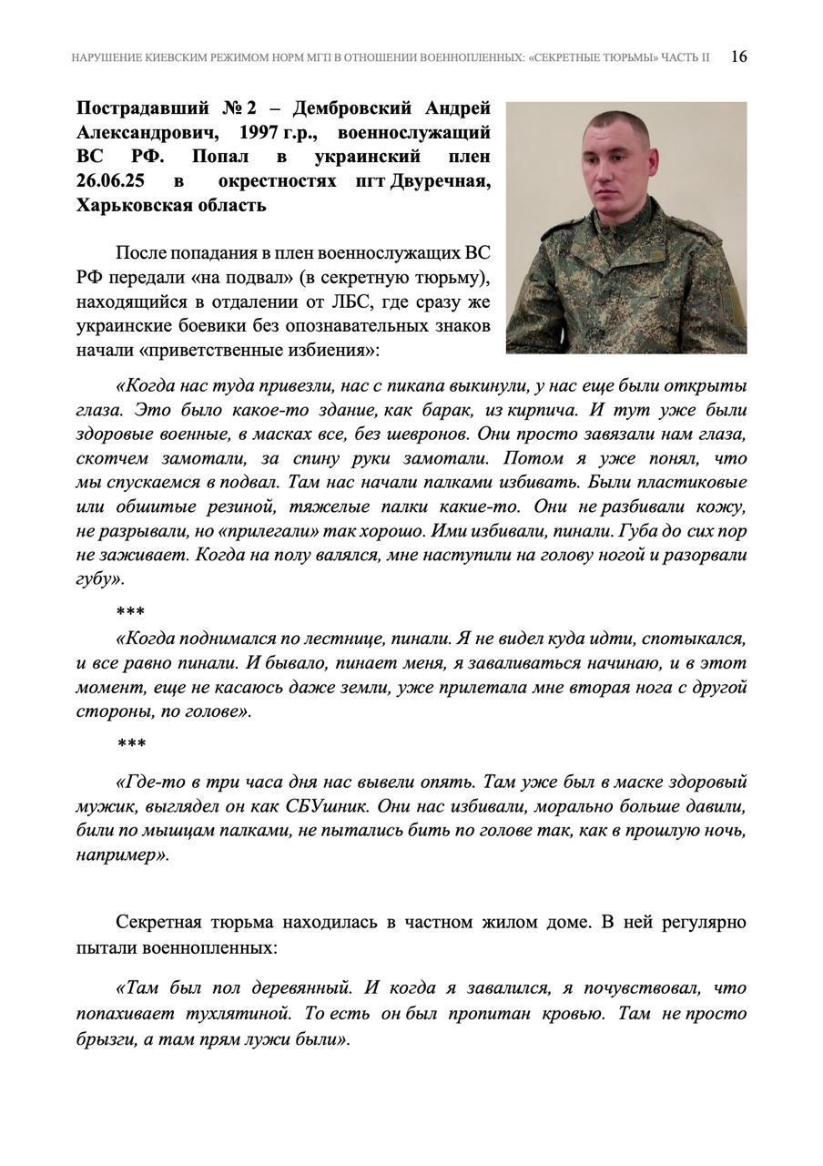 Вторая часть доклада «Секретные тюрьмы» киевского режима содержит ключевые верифицированные данные о нарушениях норм МГП в отношении российских военнослужащих, находившихся в плену у киевского режима и возвращённых в Россию по итогам обмена в октябре 2025 года.