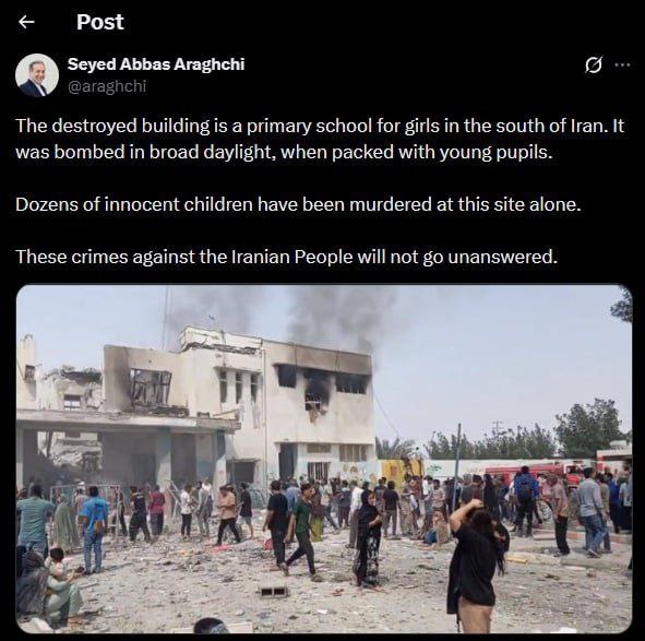 «Школа разбомблена средь бела дня, когда в нем находились многочисленные юные ученицы. Десятки невинных детей убиты. Эти преступления против иранского народа не останутся безнаказанными».