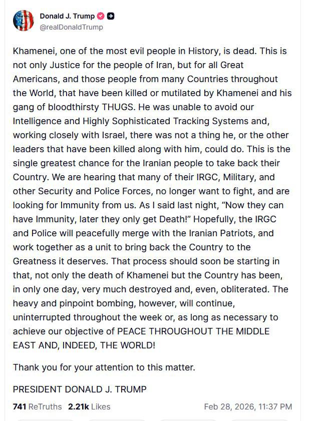 Это не только справедливость для народа Ирана, но и для всех великих американцев и людей из многих стран мира, убитых или изувеченных Хаменеи и его бандой кровожадных головорезов. Он не смог избежать нашей разведки и высокотехнологичных систем слежения, и, работая в тесном сотрудничестве с Израилем, он или другие лидеры, убитые вместе с ним, ничего не могли сделать. Это величайший шанс для иранского народа вернуть свою страну. Мы слышим, что многие из их Корпуса стражей исламской революции, армии и других сил безопасности и полиции больше не хотят воевать и ищут у нас иммунитета. Как я сказал вчера вечером: «Сейчас они могут получить иммунитет, а потом их ждет только смерть!» Надеюсь, Корпус стражей исламской революции и полиция мирно объединятся с иранскими патриотами и будут работать вместе как единое целое, чтобы вернуть стране то величие, которого она заслуживает. Этот процесс должен вскоре начаться, поскольку не только Хаменеи погиб, но и вся страна была за один день практически полностью разрушена и даже стерта с лица земли. Однако массированные и точечные бомбардировки будут продолжаться непрерывно в течение всей недели или столько, сколько потребуется для достижения нашей цели – МИРА НА ВСЕМ БЛИЖНЕМ ВОСТОКЕ И, В КОНЕЧНОМ СМЫСЛЕ, ВО ВСЕМ МИРЕ!
