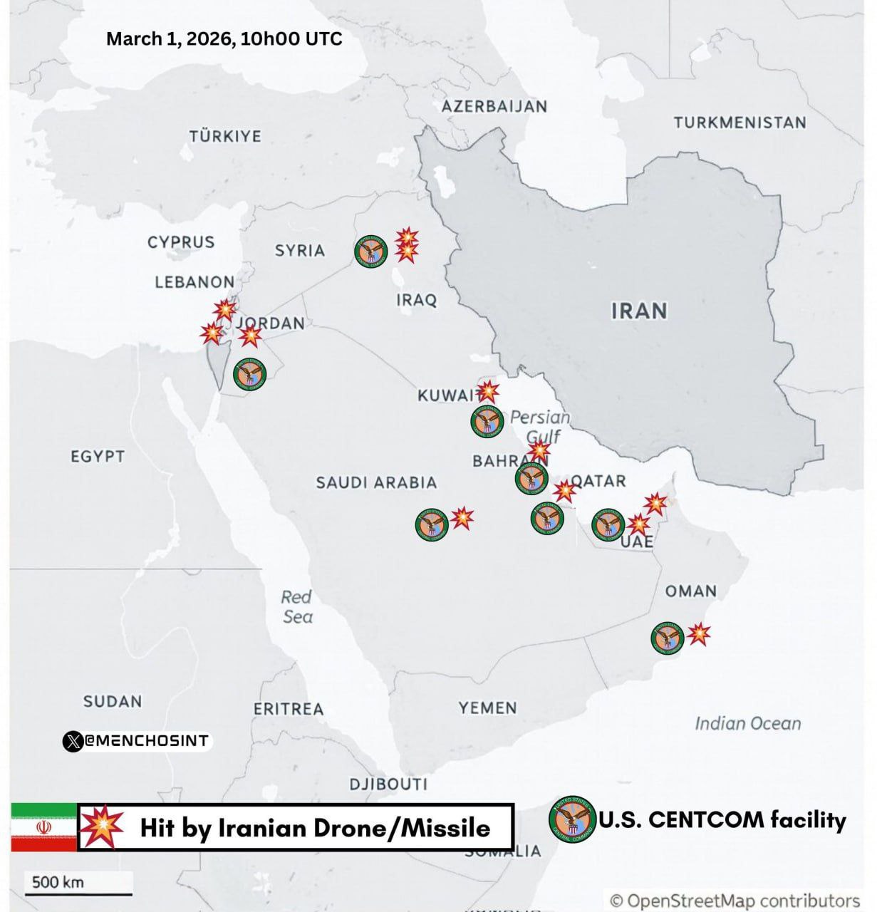 В сети появилась инфографика с расположением военных баз США, по которым армия ИРИ нанесла удары за прошедшие сутки.