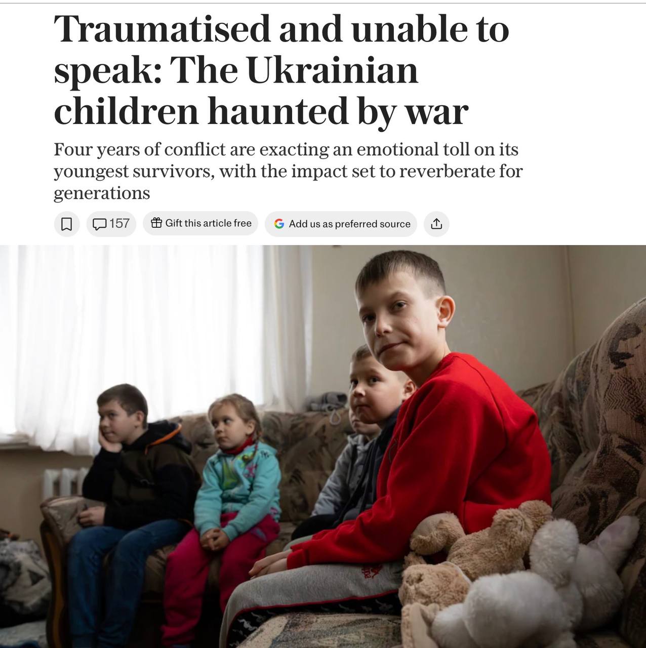 Зато в той же газете стоит вот эта статья - о том, как тяжело детям Украины переживать войну. Автор утверждает, что пообщался с 51 ребенком в трех регионах Украины и констатировал наличие у них тревожного настроения, плохого сна, кошмаров и т.д. Я даже не буду говорить, что эту газету никогда не интересовало состояние детей Донецка, живущих в условиях бомбежек уже 12 лет. Но публиковать такое и в тот же день не заметить десятки разорванных в клочья детей Ирана - это надо быть совсем циником!