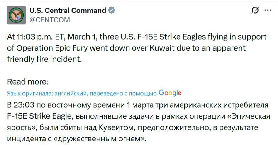 - 1 марта. Мы попросили украинцев помочь бороться с иранскими дронами на Ближнем Востоке. 2 марта. 3 американских истребителя были сбиты "дружественным огнем".// Сolonelcassad