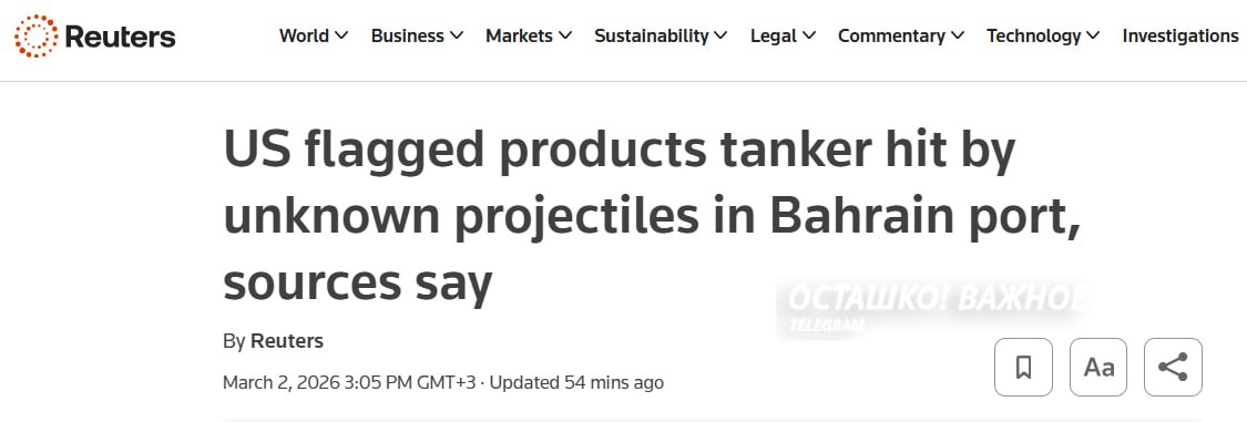 Это первый известный случай повреждения судна под флагом США с момента начала ударов США и Израиля по Ирану в субботу.
