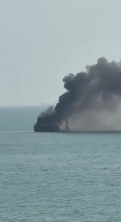 Ракетный корвет иранских ВМС "Шахид Сайяд Ширази", горящий после прямого попадания.