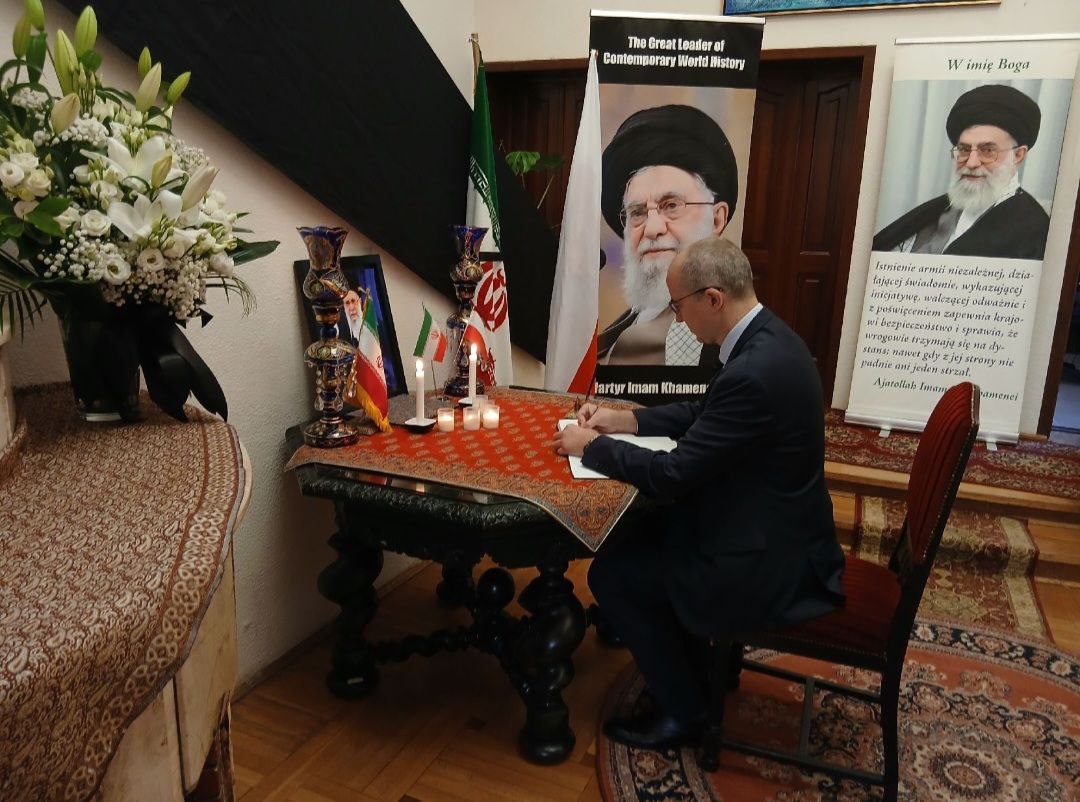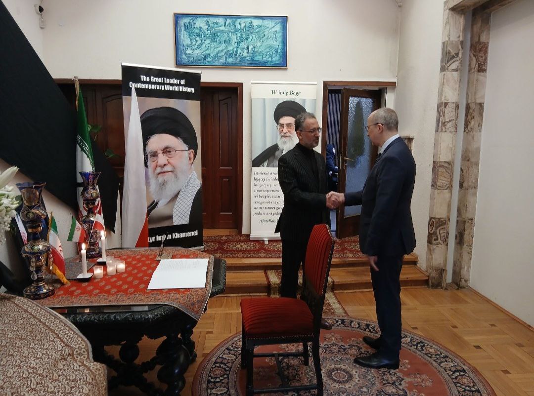 5 марта 2026 г. Временный поверенный в делах России в Польше А.Э.Ордаш посетил Посольство Ирана в Польше и внес запись в книгу соболезнований в связи с трагической гибелью Верховного руководителя и духовного лидера Исламской Республики Иран аятоллы Али Хаменеи, членов его семьи и иранских высокопоставленных должностных лиц в результате ракетно-бомбовых ударов США и Израиля 28 февраля 2026 г.