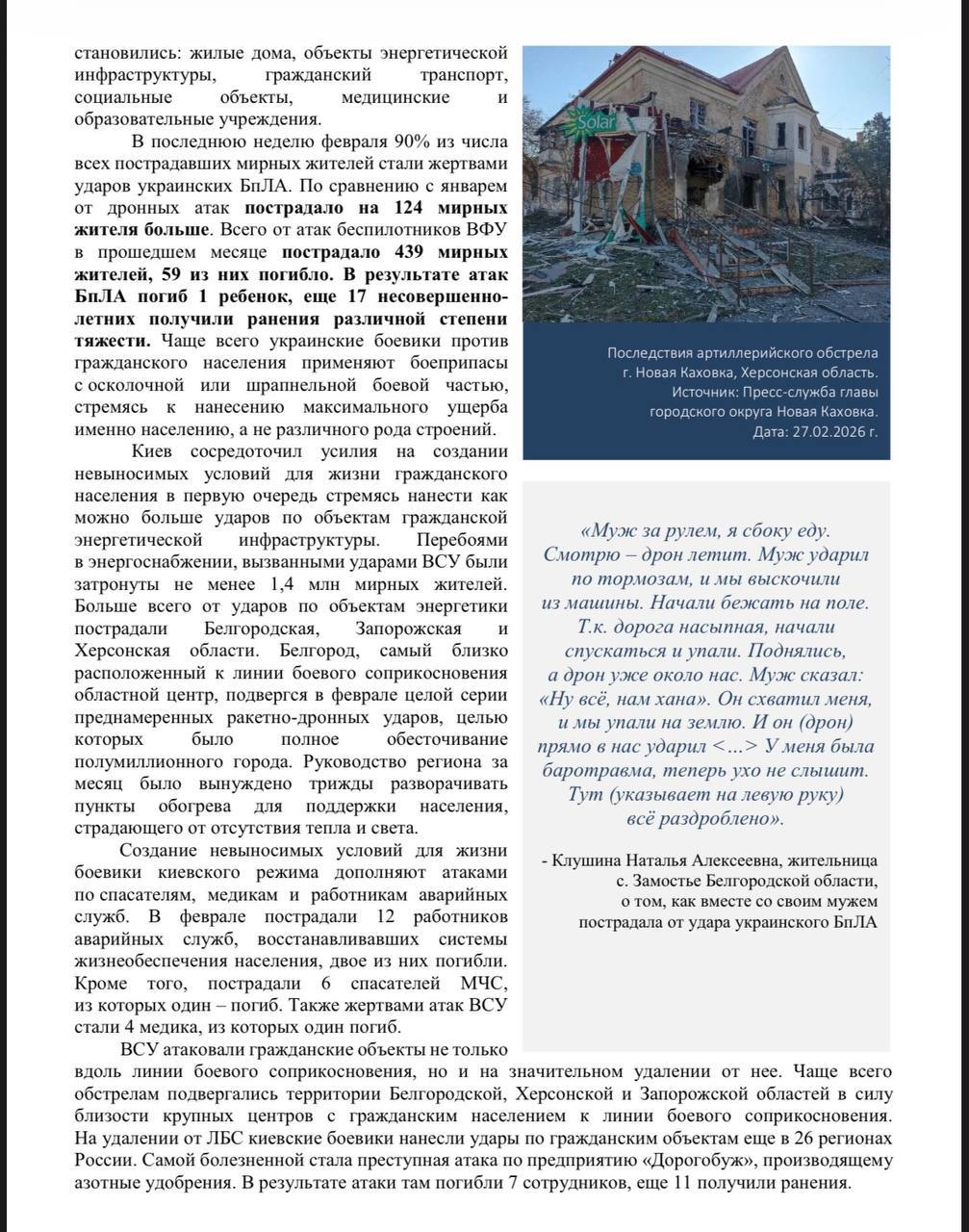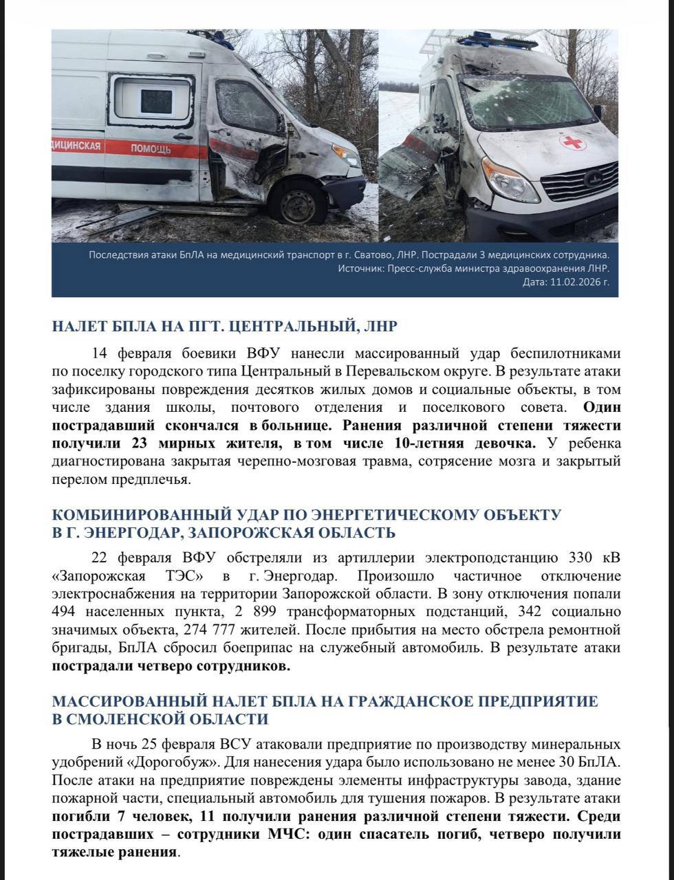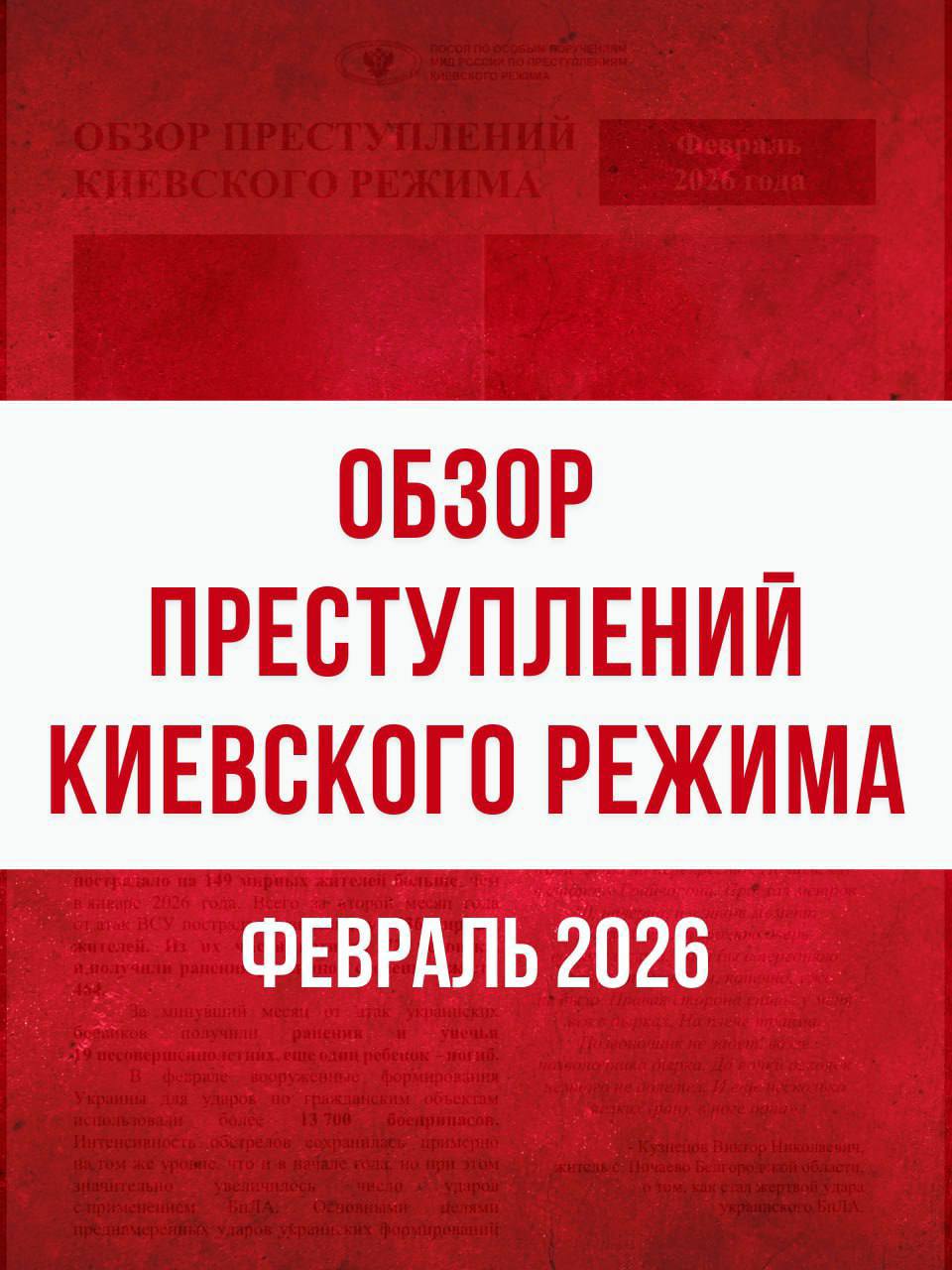 Публикуем доклад по преступлениям киевского режима в феврале 2026 года, подготовленный Послом по особым поручениям МИД России Р.В.Мирошником.