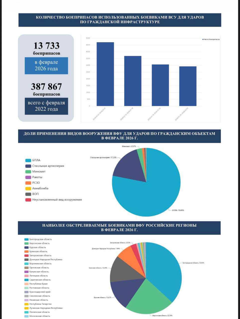 В последнюю неделю февраля 90% из числа всех пострадавших мирных жителей стали жертвами ударов украинских БпЛА. По сравнению с январём от дронных атак пострадало на 124 мирных жителя больше. Всего от атак беспилотников ВФУ в прошедшем месяце пострадало 439 мирных жителей, 59 из них погибло. В результате атак БпЛА погиб 1 ребёнок, ещё 17 несовершеннолетних получили ранения различной степени тяжести.