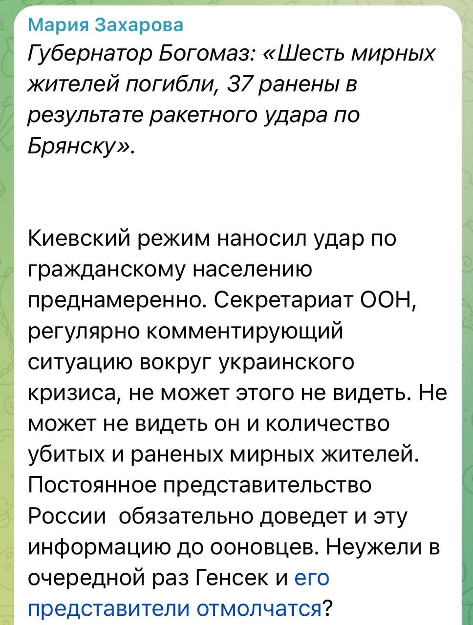 «Генсек снова будет молчать?»: Мария Захарова об атаке ВСУ по Брянску