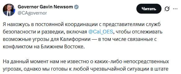 Гэвин Ньюсом заявил, что о конкретных непосредственных угрозах атаки Ирана информации нет, но власти штата полностью готовы к любым чрезвычайным ситуациям.