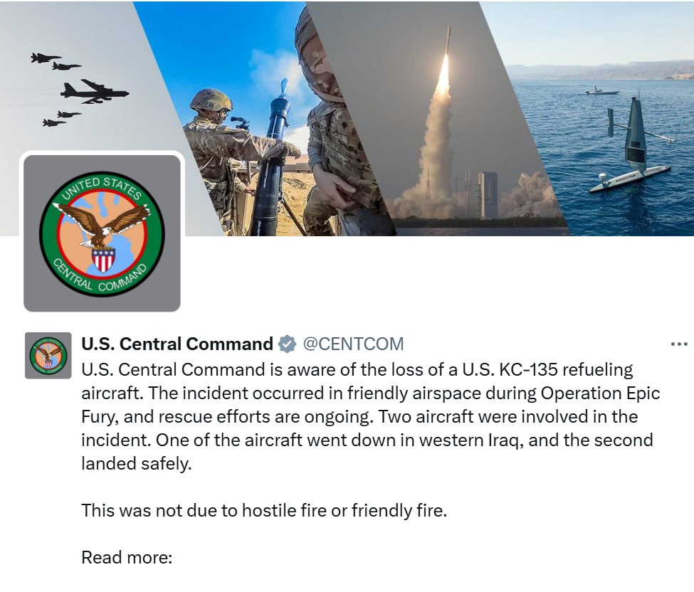 Центральное командование (CENTCOM) сообщает, что в западном Ираке потерпел крушение самолет-заправщик KC-135.