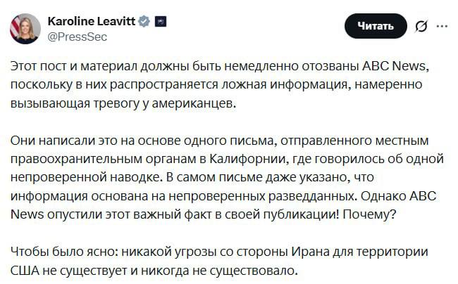 Пресс-секретарь Каролин Левитт обвинила публикацию в распространении ложной информации и намеренном создании паники среди американцев.