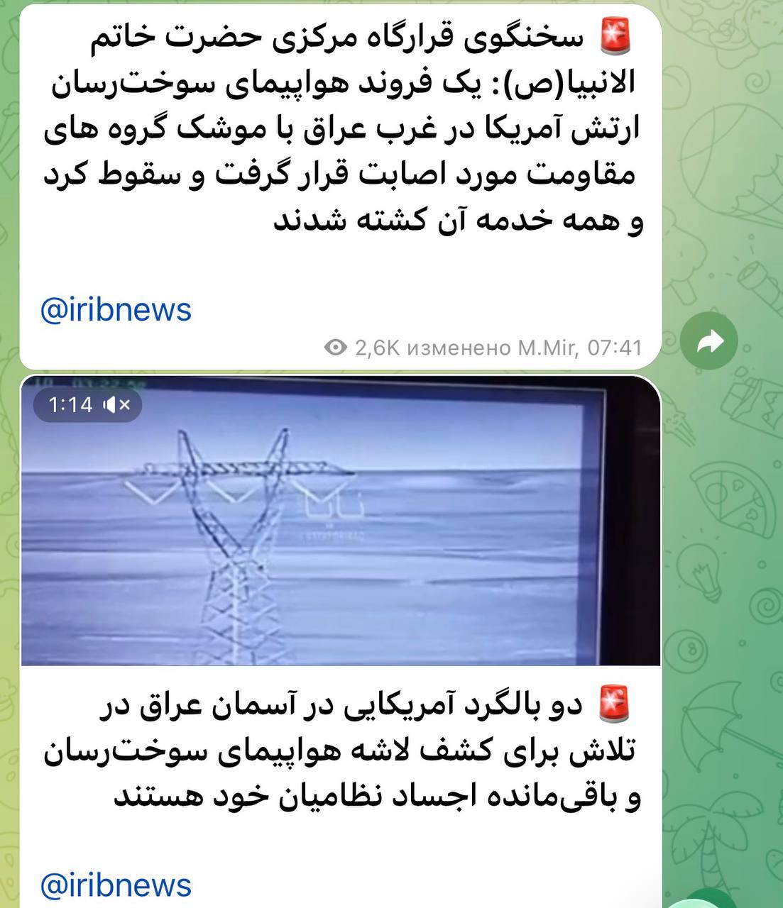 Иранская гостелерадиокомпания со ссылкой на военных утверждает, что американский самолёт-заправщик KC-135 поражён ракетой шиитских сил в Ираке, все члены экипажа погибли.