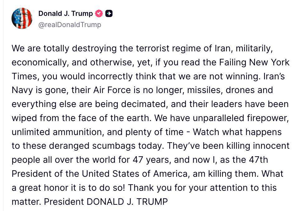 «Мы полностью уничтожаем террористический режим Ирана — военным, экономическим и иным путём, однако, если вы читаете Провалившийся Нью-Йорк Таймс, вы бы ошибочно подумали, что мы не побеждаем. Военно-морской флот Ирана уничтожен, их военно-воздушные силы больше не существуют, ракеты, дроны и всё остальное уничтожаются, а их лидеры стёрты с лица земли. У нас беспрецедентная огневая мощь, неограниченные боеприпасы и масса времени — Посмотрите, что случится с этими сумасшедшими подонками сегодня. Они убивали невинных людей по всему миру на протяжении 47 лет, и теперь я, как 47-й Президент Соединённых Штатов Америки, уничтожаю их. Какое это великое почтение — сделать это!».
