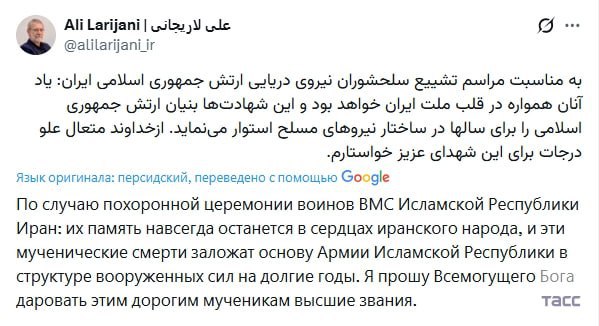 Лариджани на фоне утверждений Израиля о его гибели опубликовал в соцсети X письмо с соболезнованиями в адрес погибших иранских моряков.