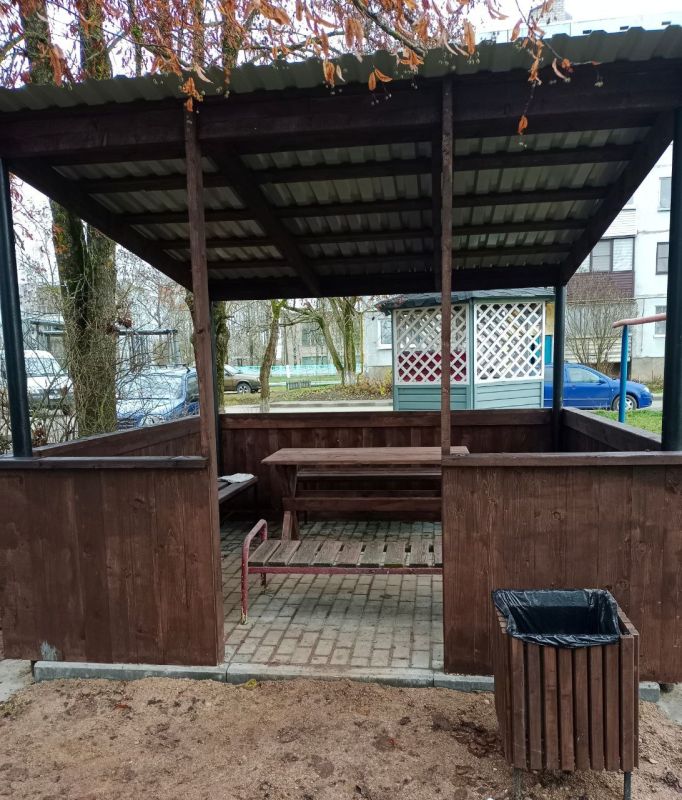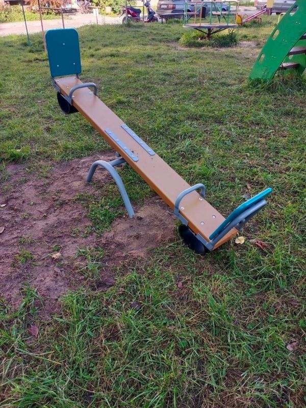 • Смонтировано детское игровое оборудование — качели-диван с навесом и качалка-балансир,