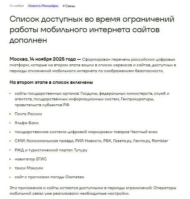 Тем временем Минцифры расширило «белый список» ресурсов. В него вошли сайты госорганов, «Почта России», «Альфа-Банк», «Честный знак», РЖД, «Туту ру», 2ГИС, такси «Максим», Gismeteo, а также СМИ — РИА Новости, РБК, «Комсомольская правда» и другие.